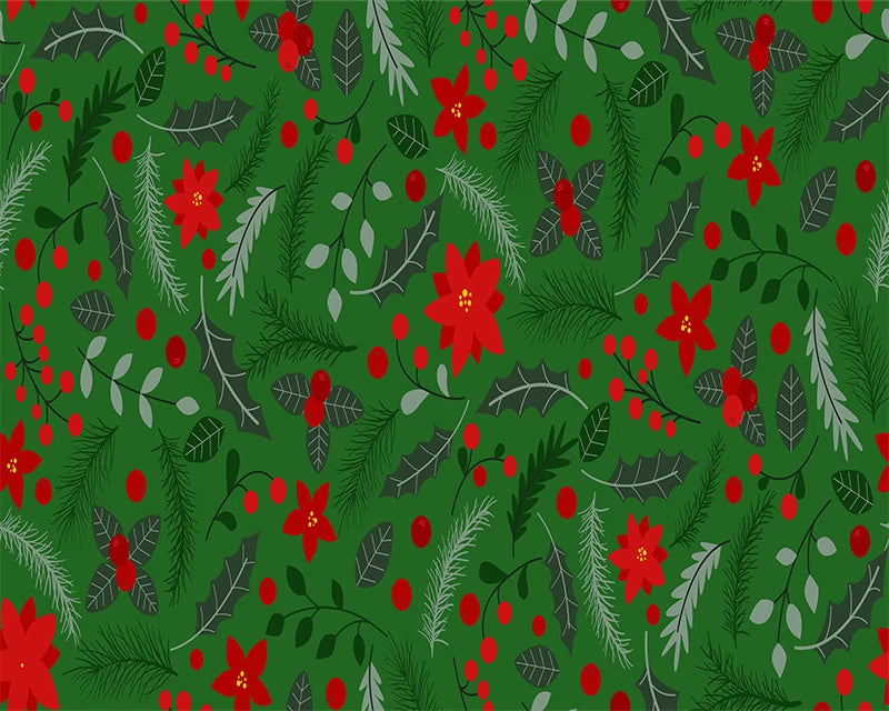 Add a fresh and festive touch to your sewing projects with this vibrant poinsettia print polycotton fabric. Featuring detailed flowers and leaves on a green background, the digitally printed design brings a lively and elegant feel, perfect for seasonal decor, apparel, and accessories.