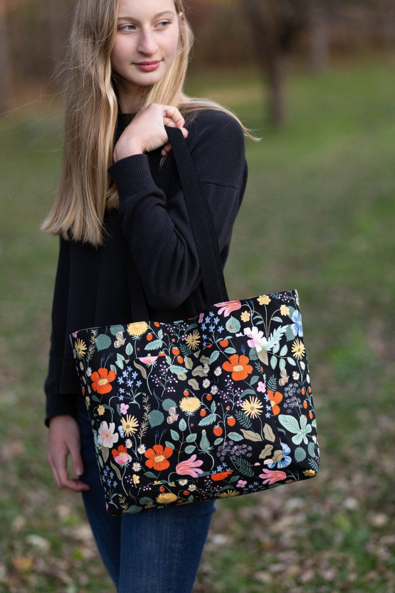 It features a front pocket (great for adding custom details or featuring a favorite fabric); divided interior pocket; recessed zipper closure (optional) or magnetic snap closures (optional) and will teach you a lot of fundamental bag making skills.