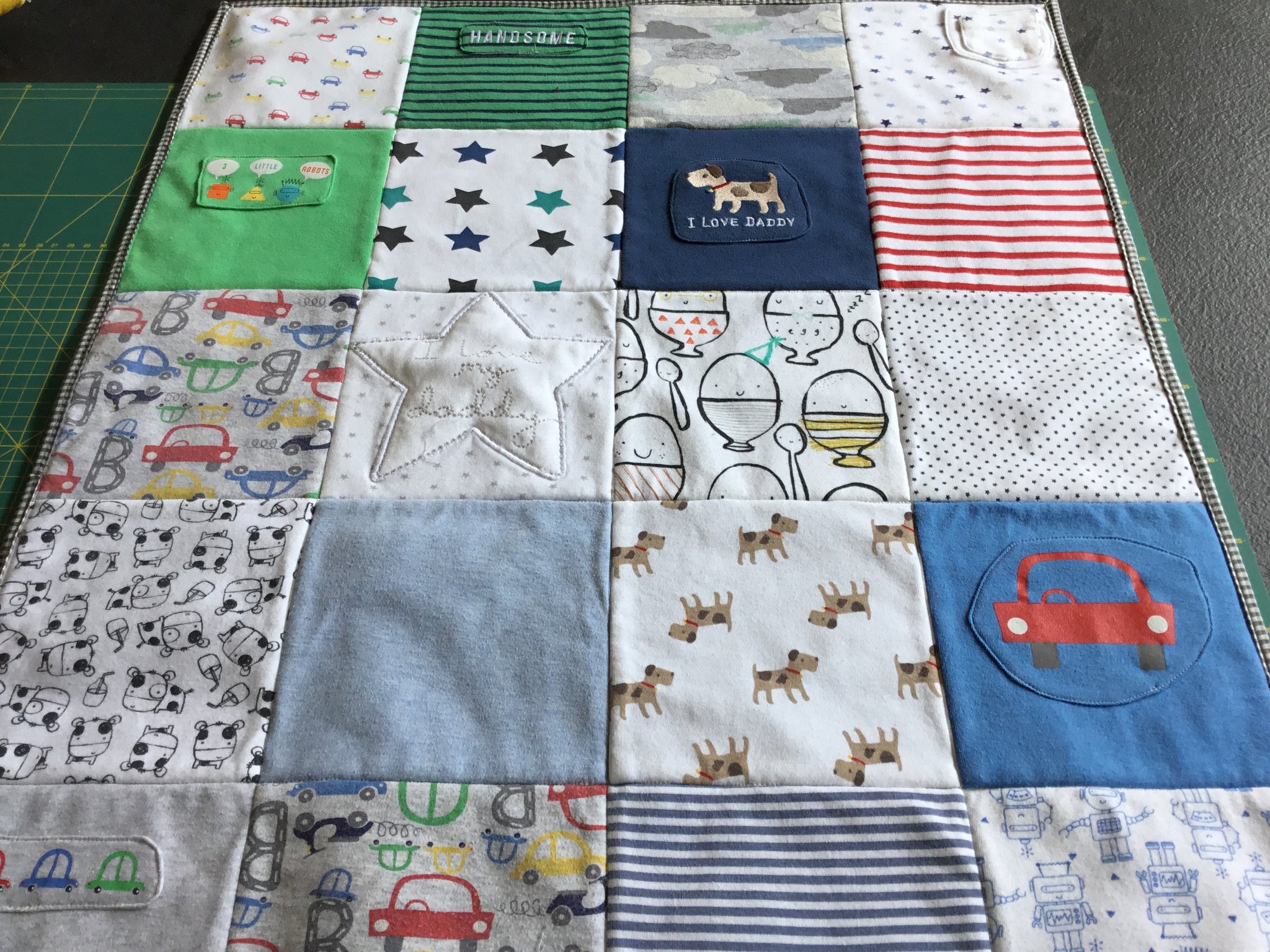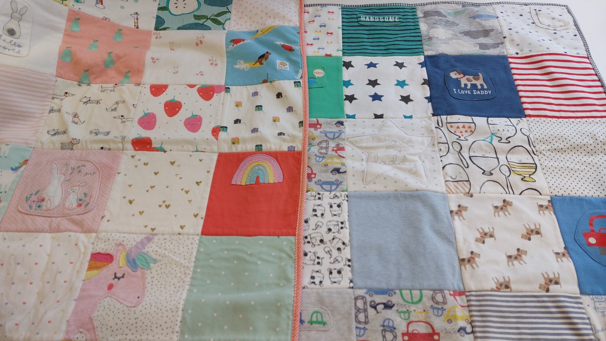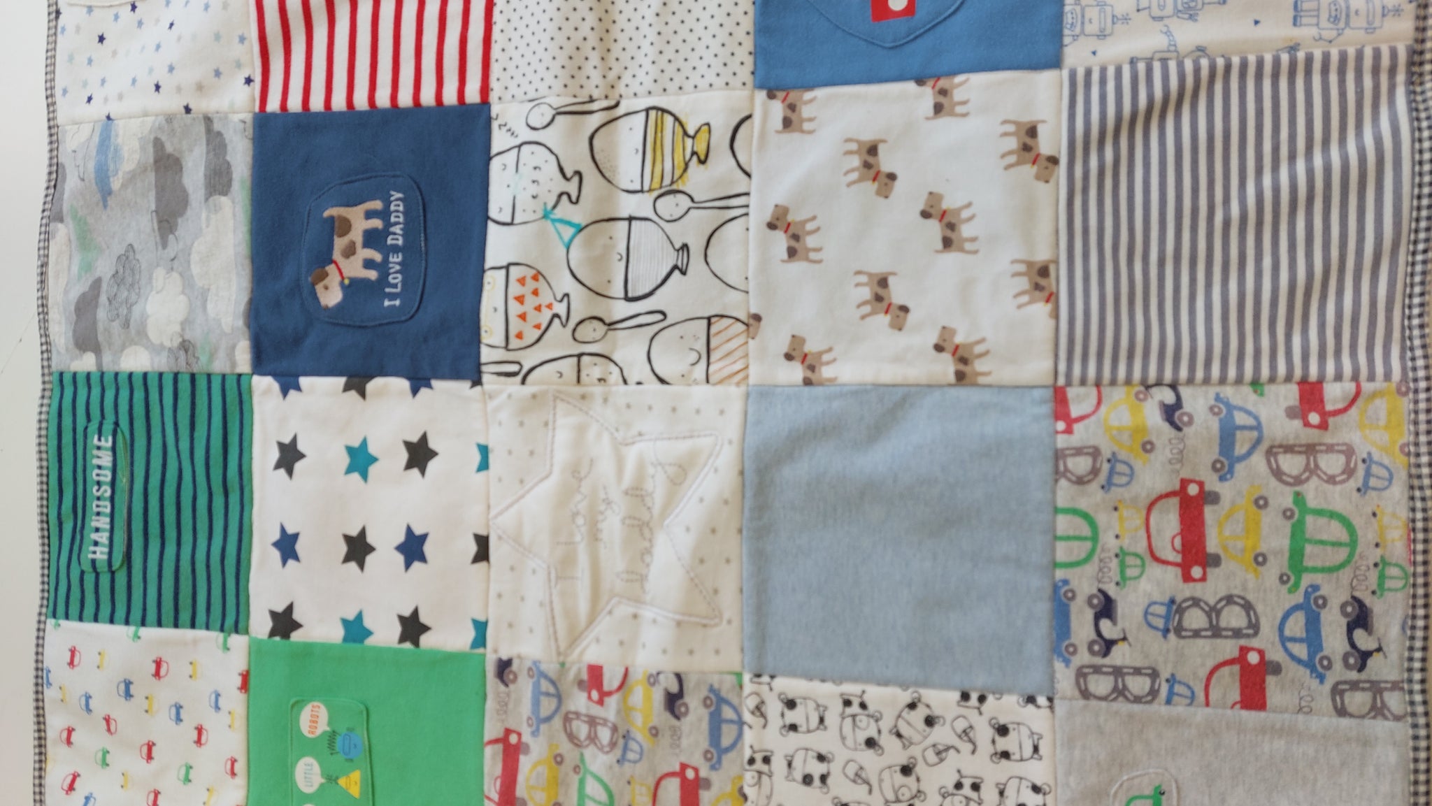 Why not make them into a beautiful quilt that you can then see every day? Or make one as a really special gift. We use all the features of their clothing - from the patterns to the labels to buttons and fastenings. Each square is specially designed to make the most of the features of the garment.