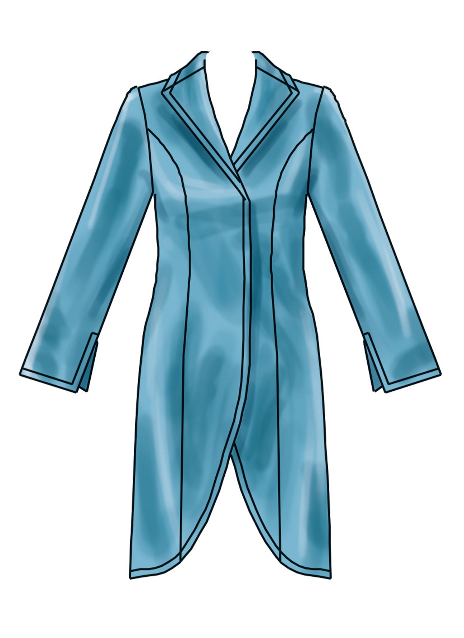 Lined jacket has princess seams, long sleeves with slits and topstitched details.