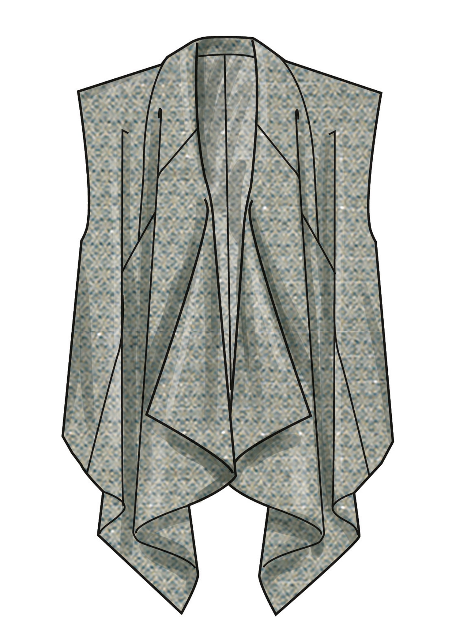 Loose fitting draped front jacket and vest have an open-front and back darts. Fitted, straight leg trousers have side seam pockets and fly front closure.