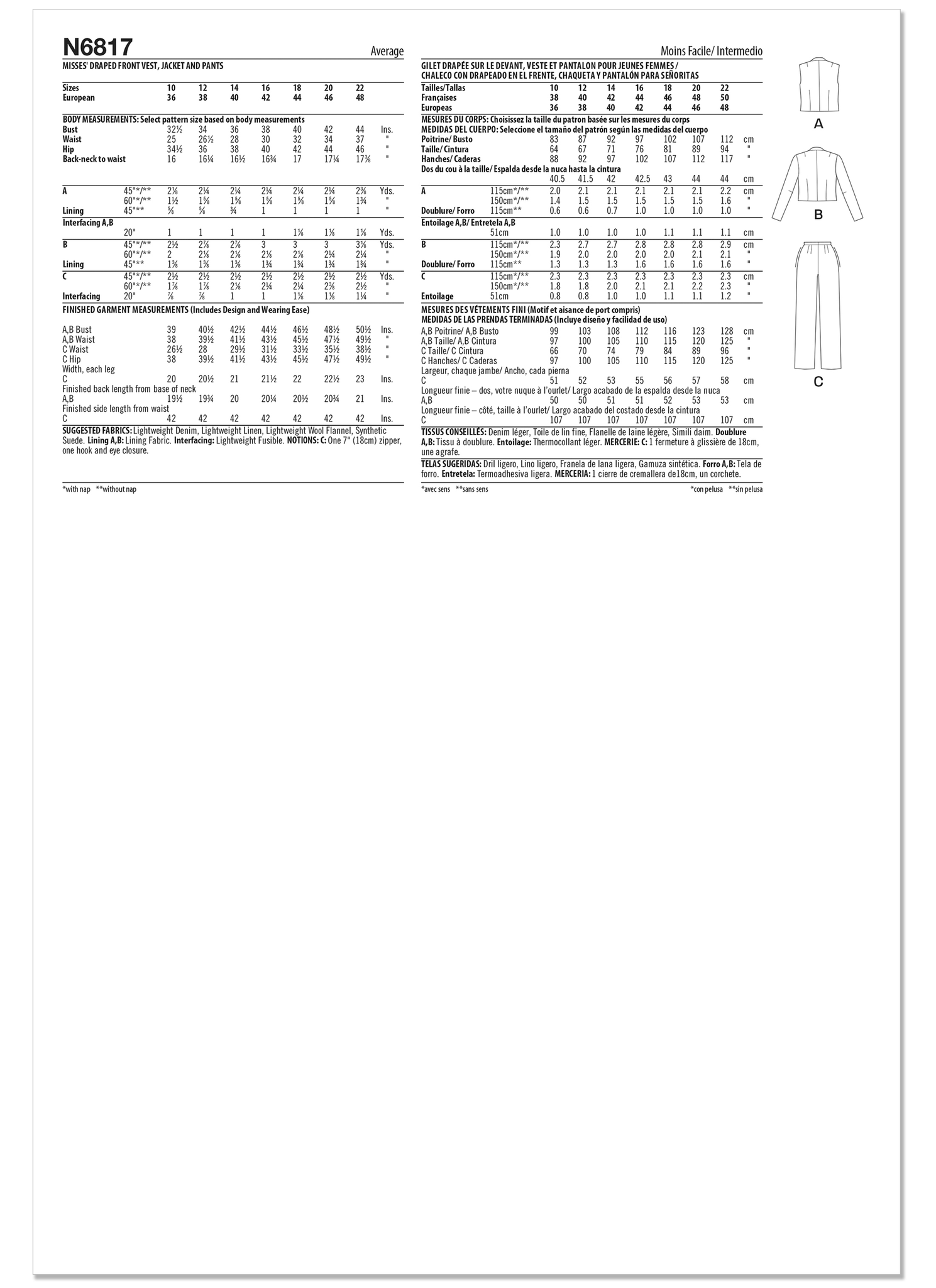 Lightweight Denim, Lightweight Linen, Lightweight Wool Flannel, Synthetic Suede. Lining A,B: Lining Fabric. Interfacing: Lightweight Fusible.