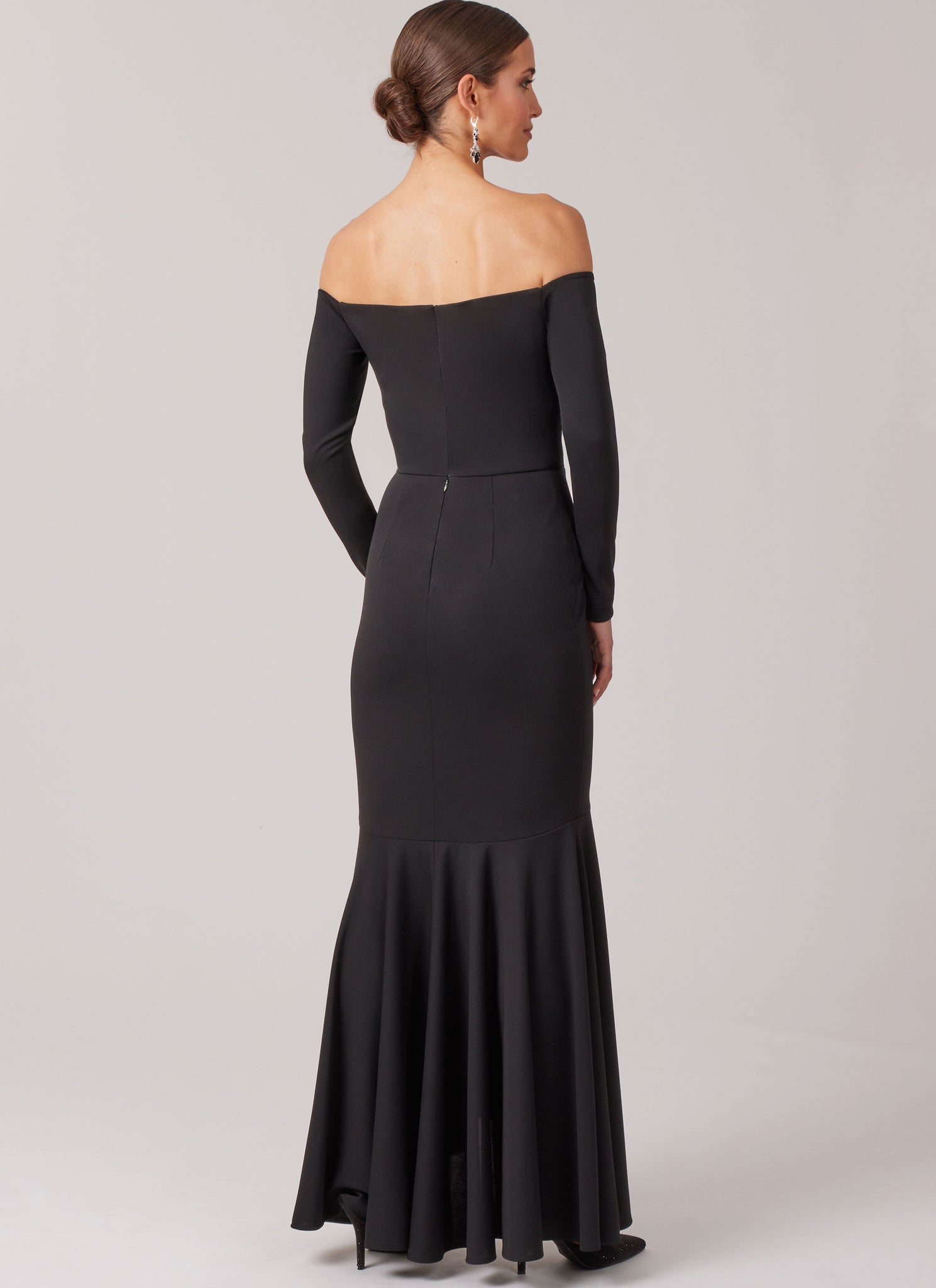Close-fitting, off-the-shoulder trumpet dress has underlined bodice, invisible back zipper, long sleeves and length variations.