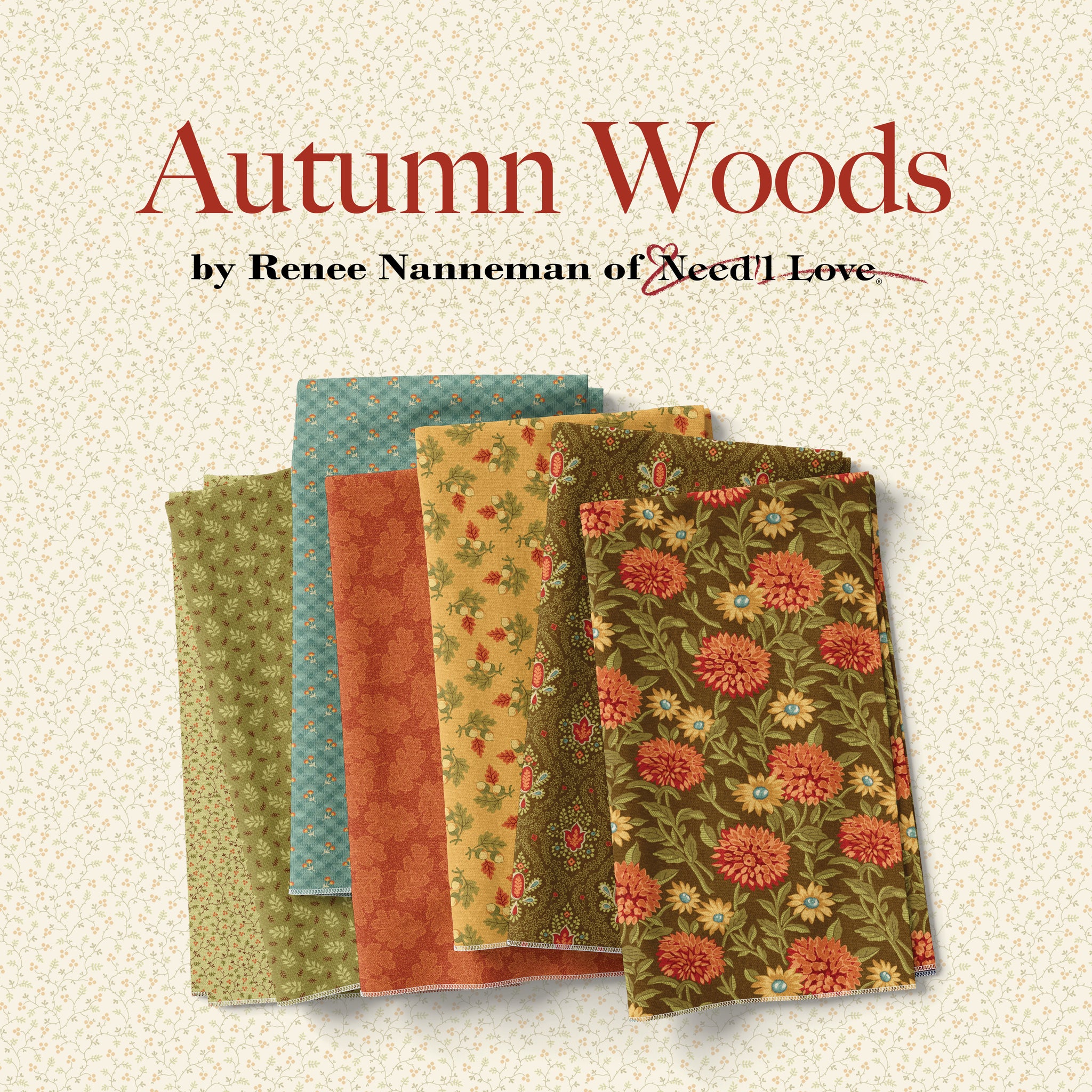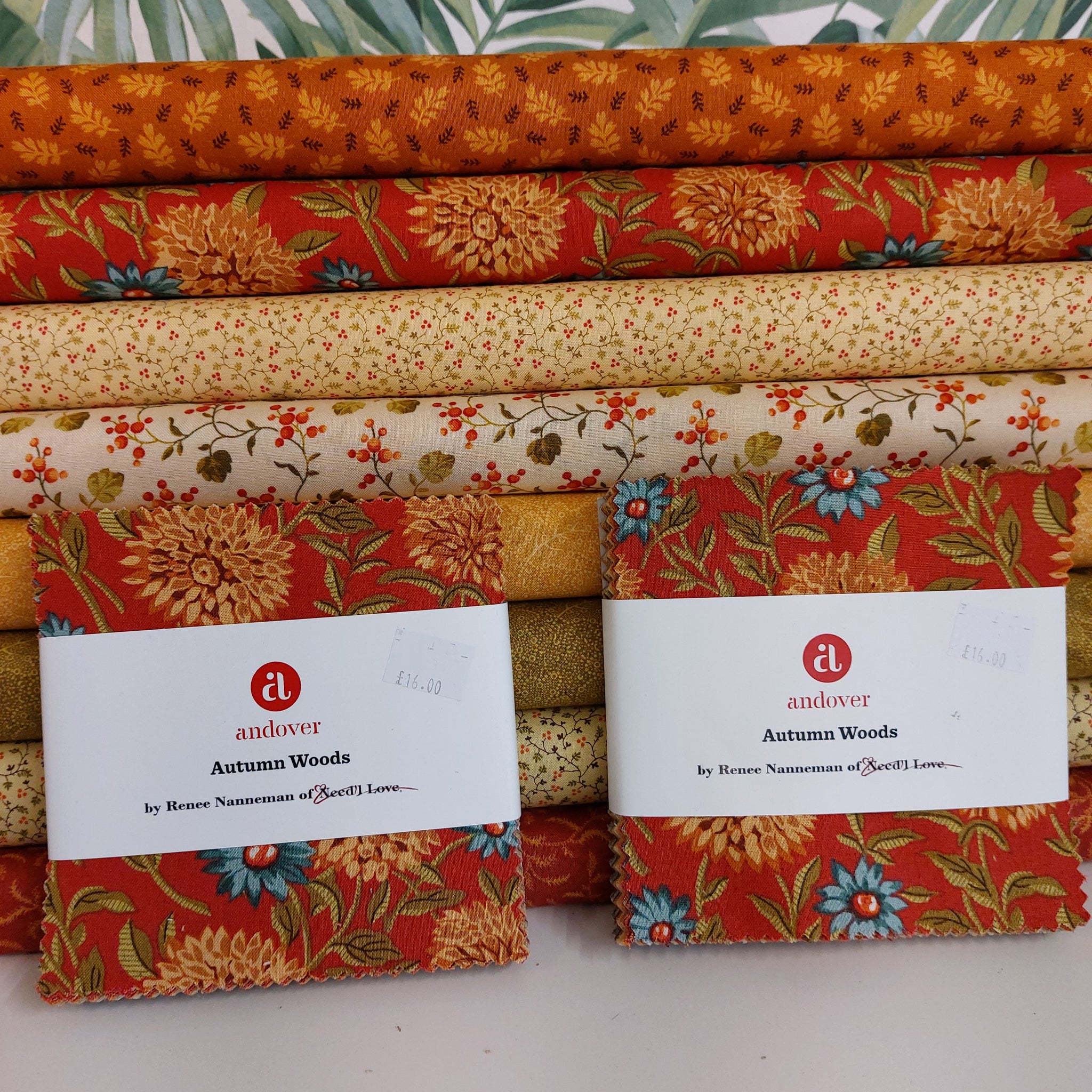 This charm pack contains 42 x 5" squares of quilting cotton from the Autumn woods range from Andover Fabrics for Makower UK.