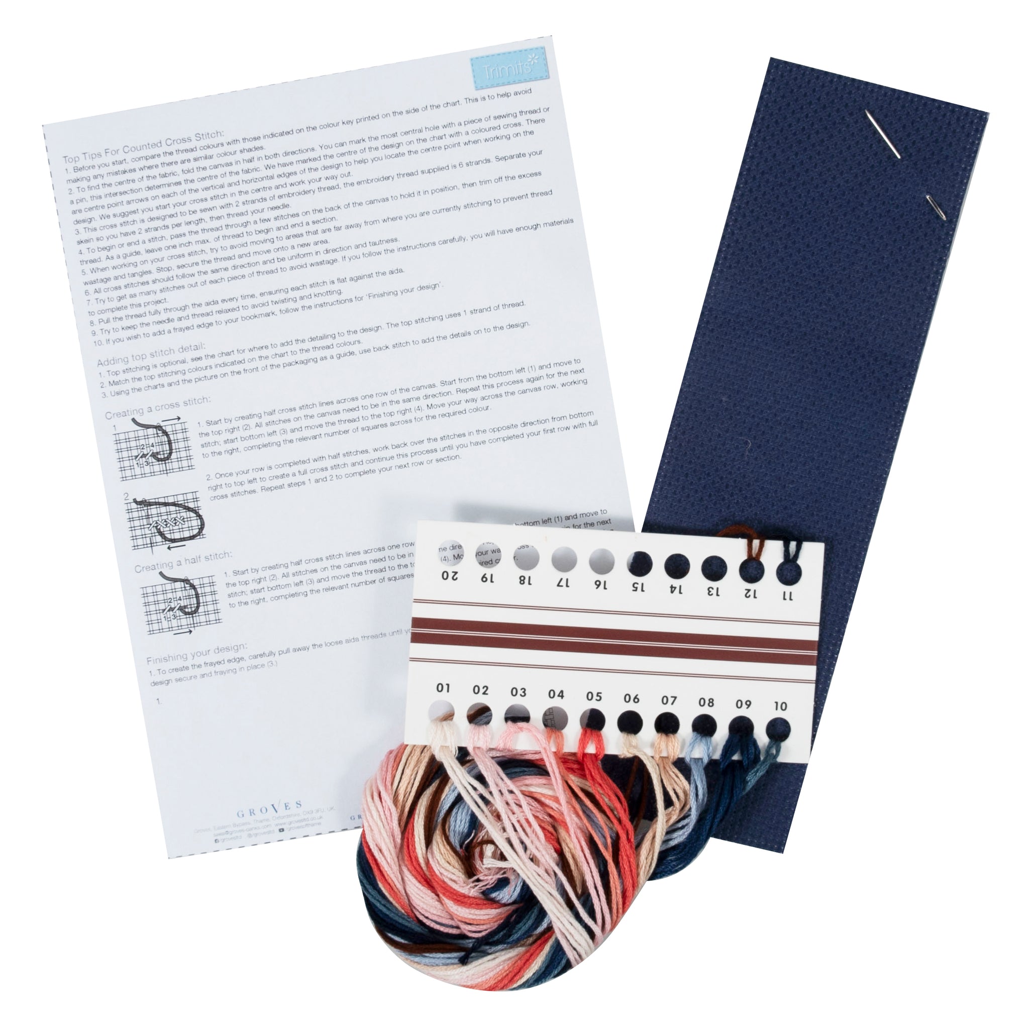 Kit includes: blue cotton 14 count aida fabric; pre-sorted 6 strand polyester embroidery threads; needle; printed colour coded design and instructions.