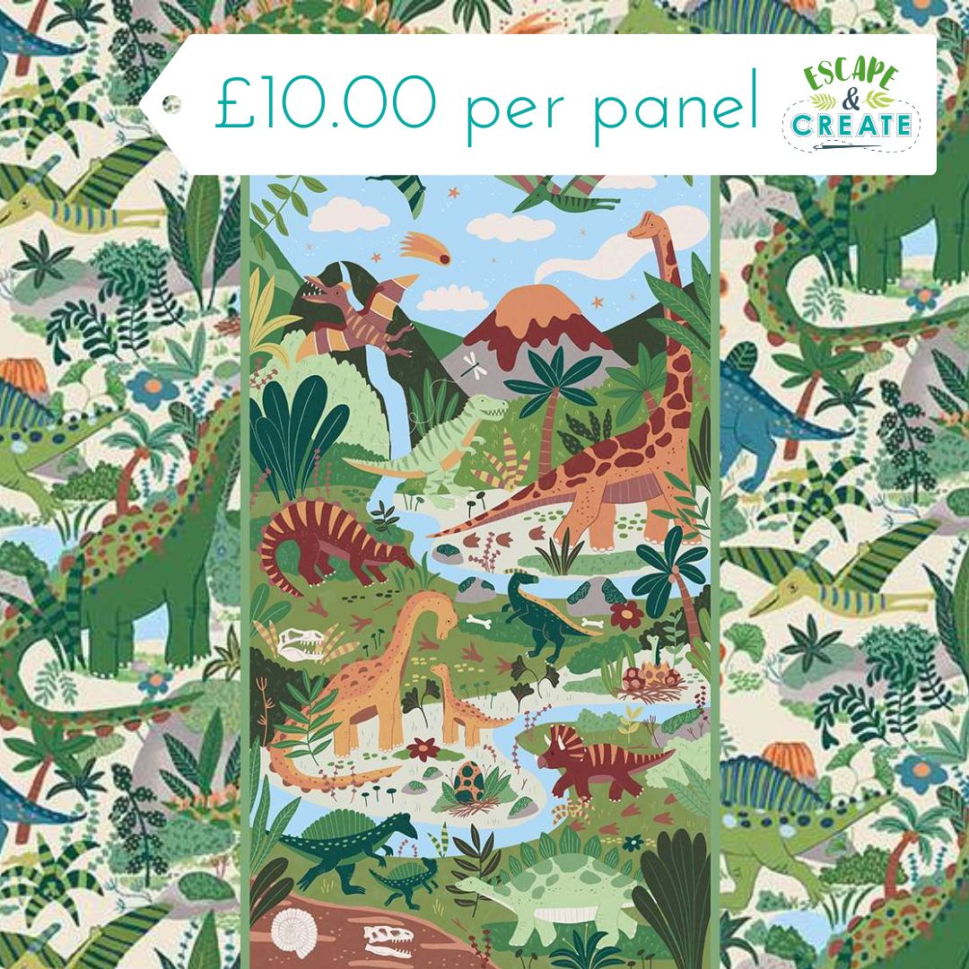 This fun prehistoric themed fabric print by Makower depicts an ancient jungle filled with dinosaurs, prehistoric trees and plants, and meteors in the sky.