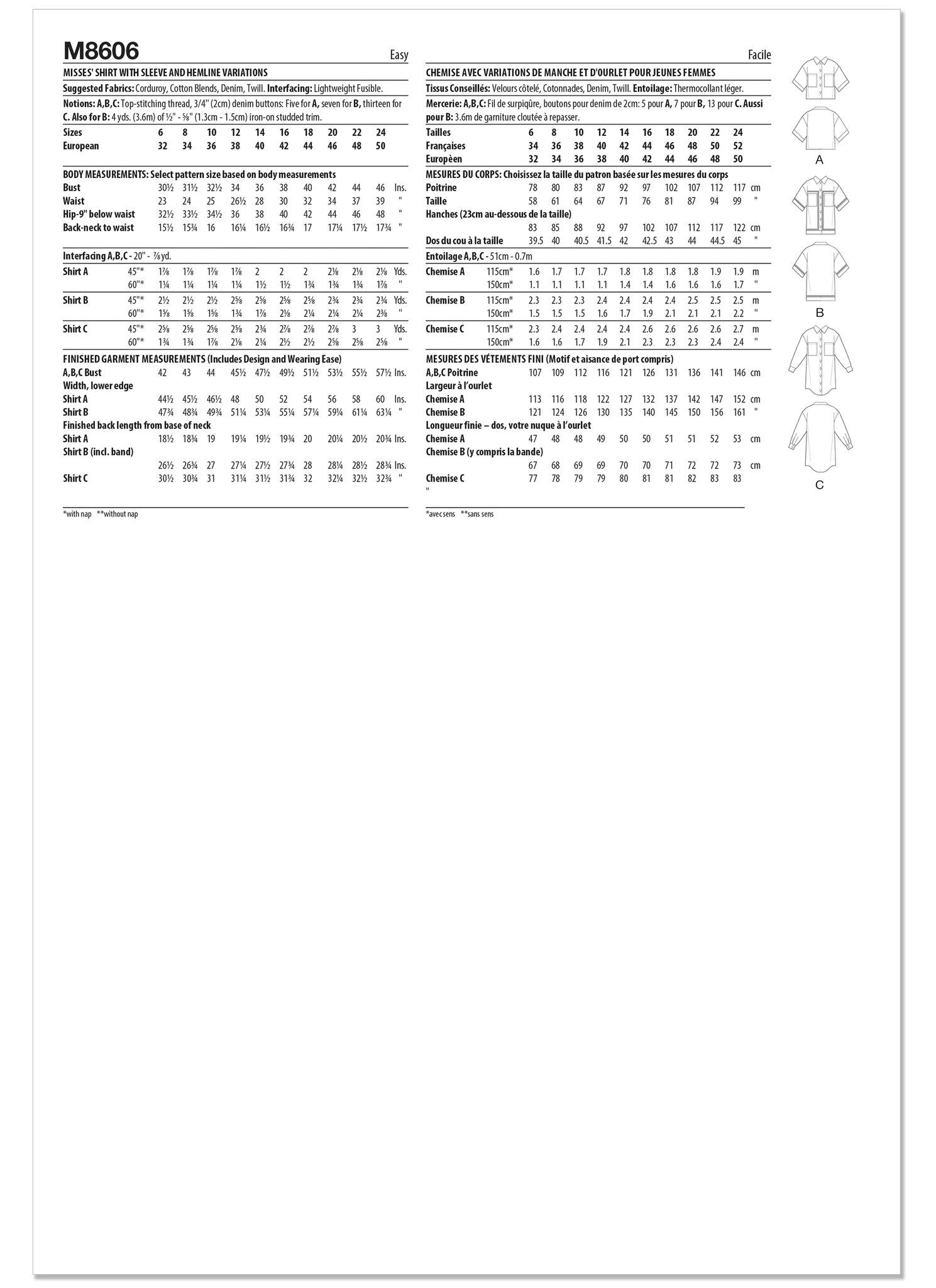 McCall’s Sewing Pattern M8606 Misses’ Shirt with Sleeve and Hemline Variations.