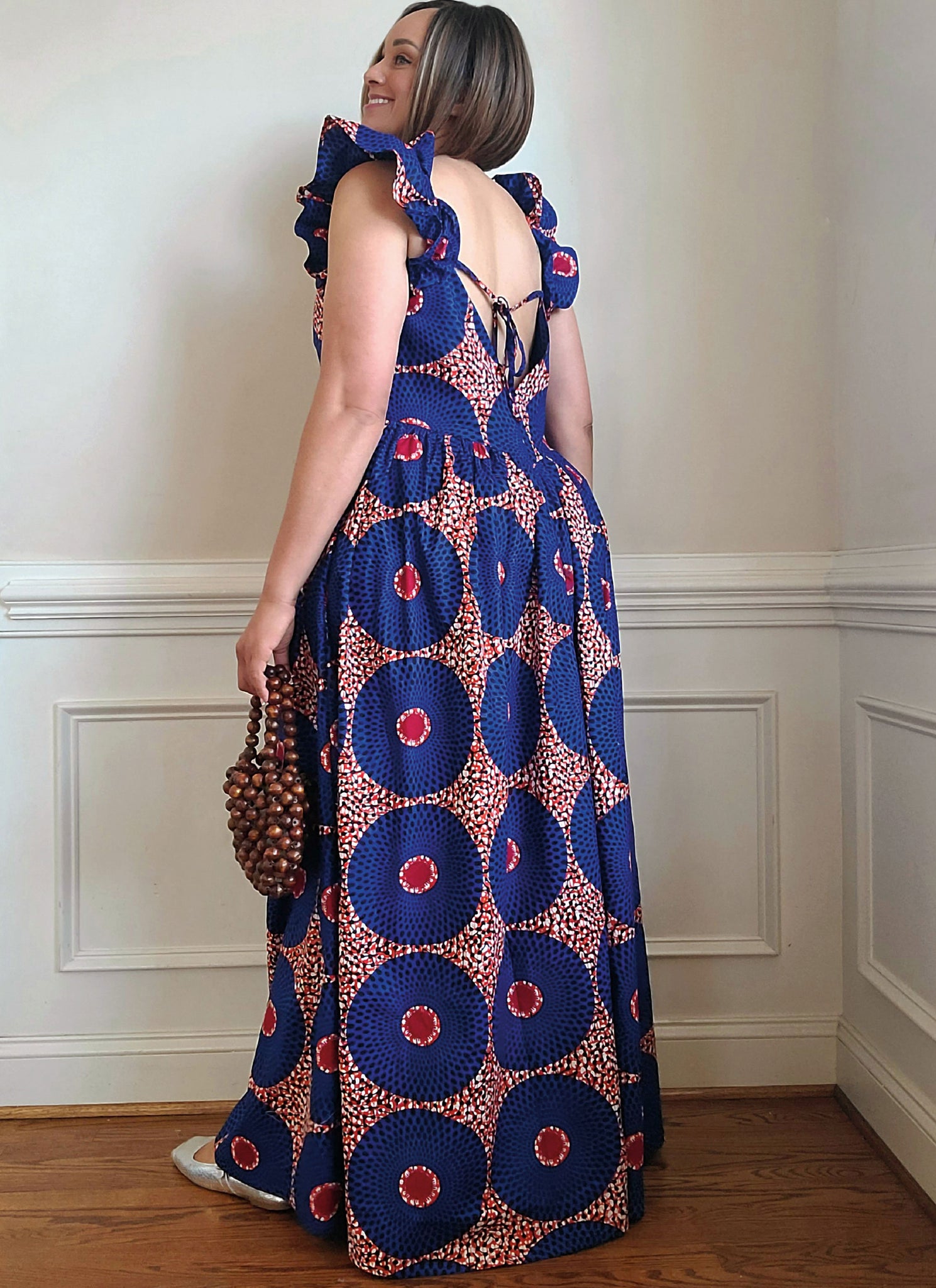 Loose fitting summer dress with deep V-neckline has ruffled shoulder detail, gathered skirt, side seam pockets, invisible zipper closure and ties at the back. View A is knee length. View B is floor length.