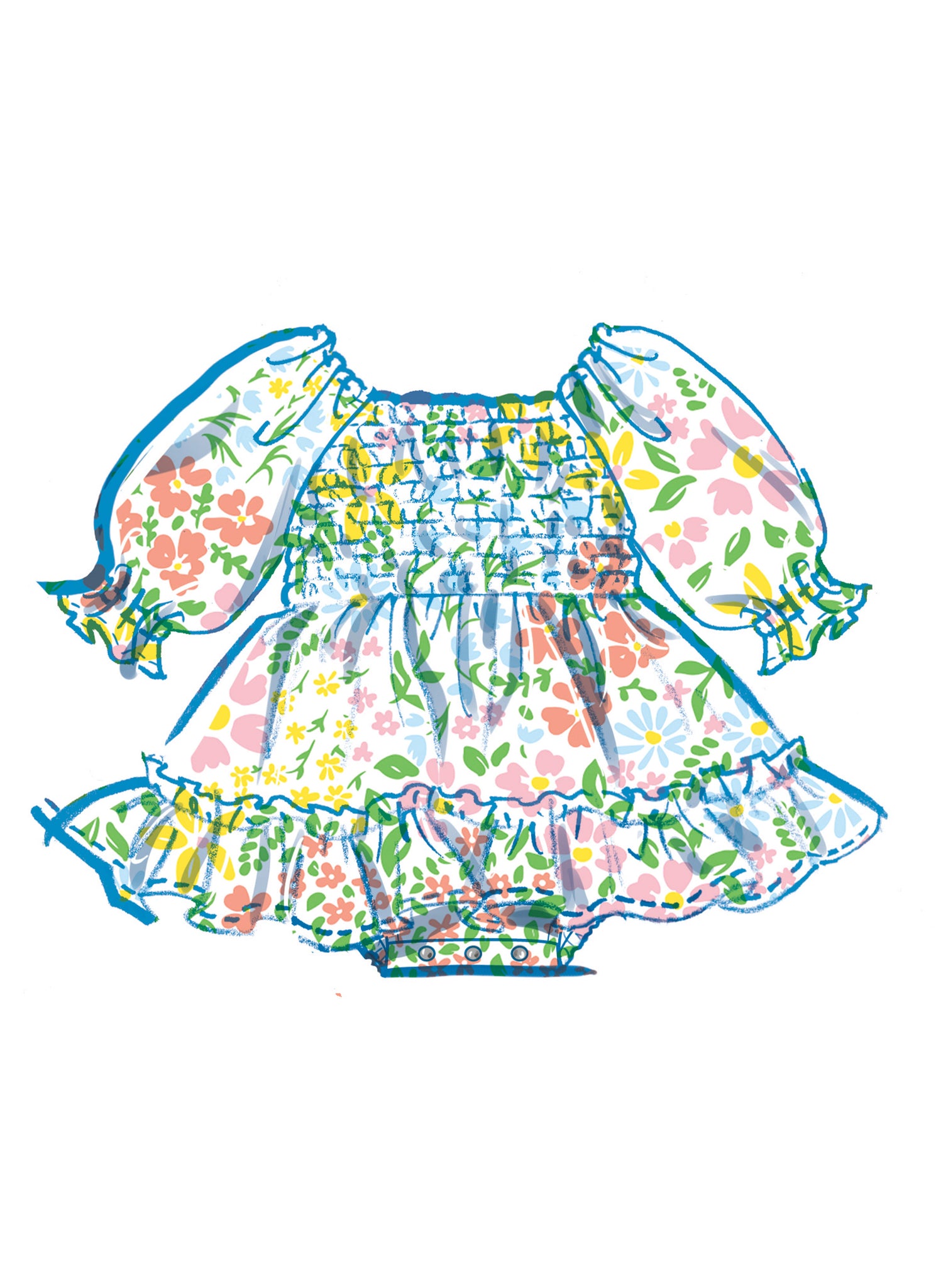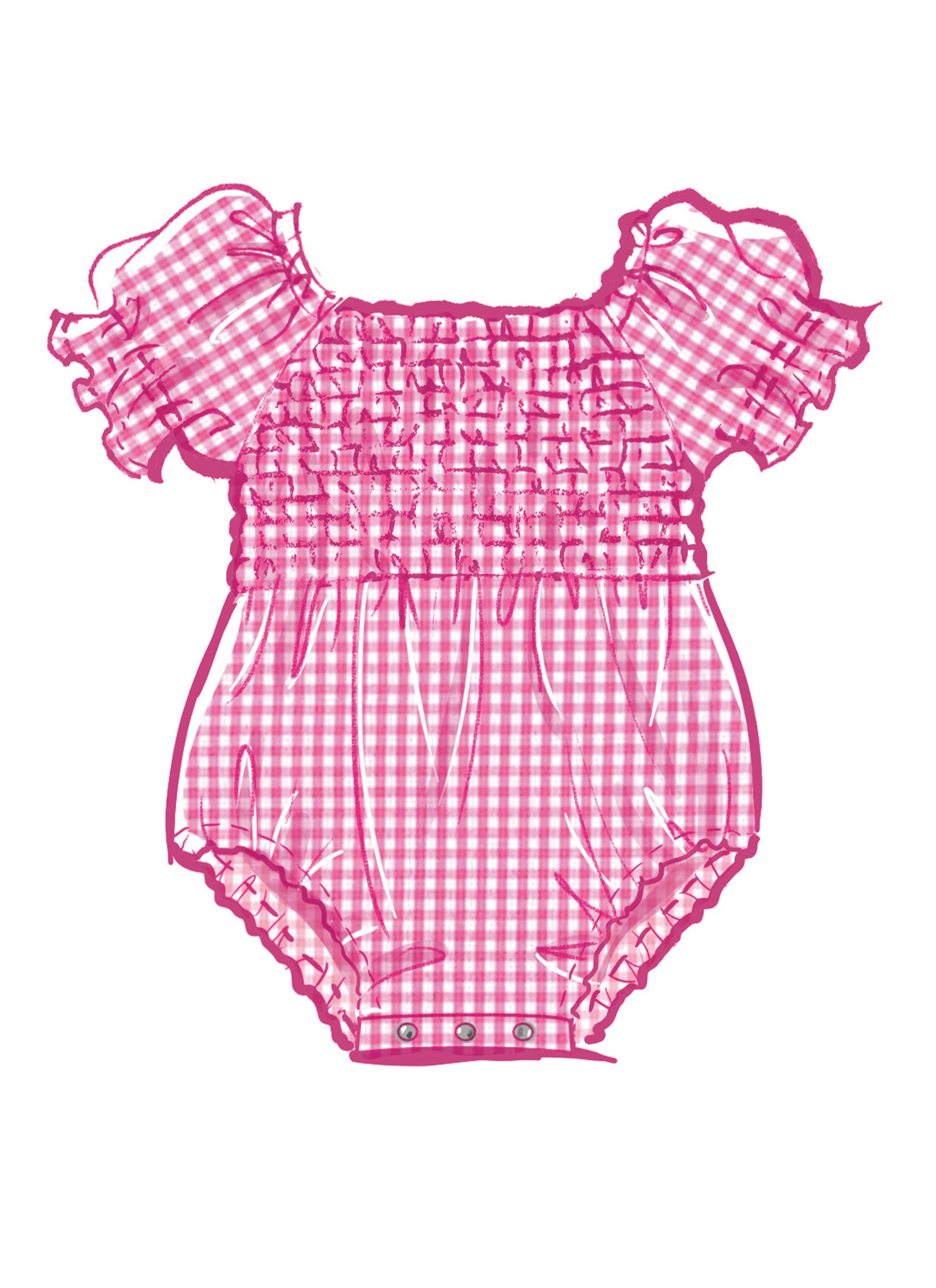 Adorable, shirred baby romper and dresses have elastic neckline, ruffled sleeves and purchased snap tape closure. Views B and C have gathered tier and ruffles at skirt. Complete the outfit with the matching bow headband.