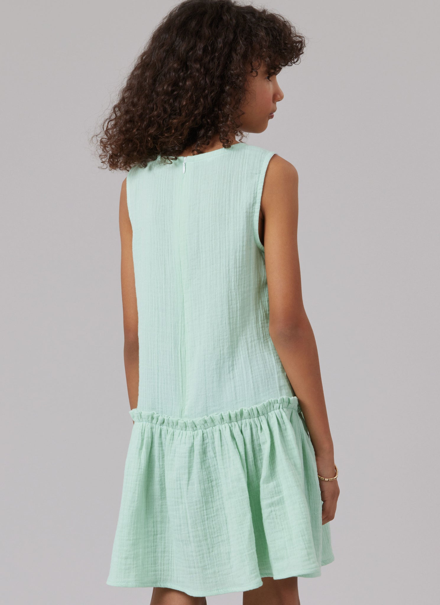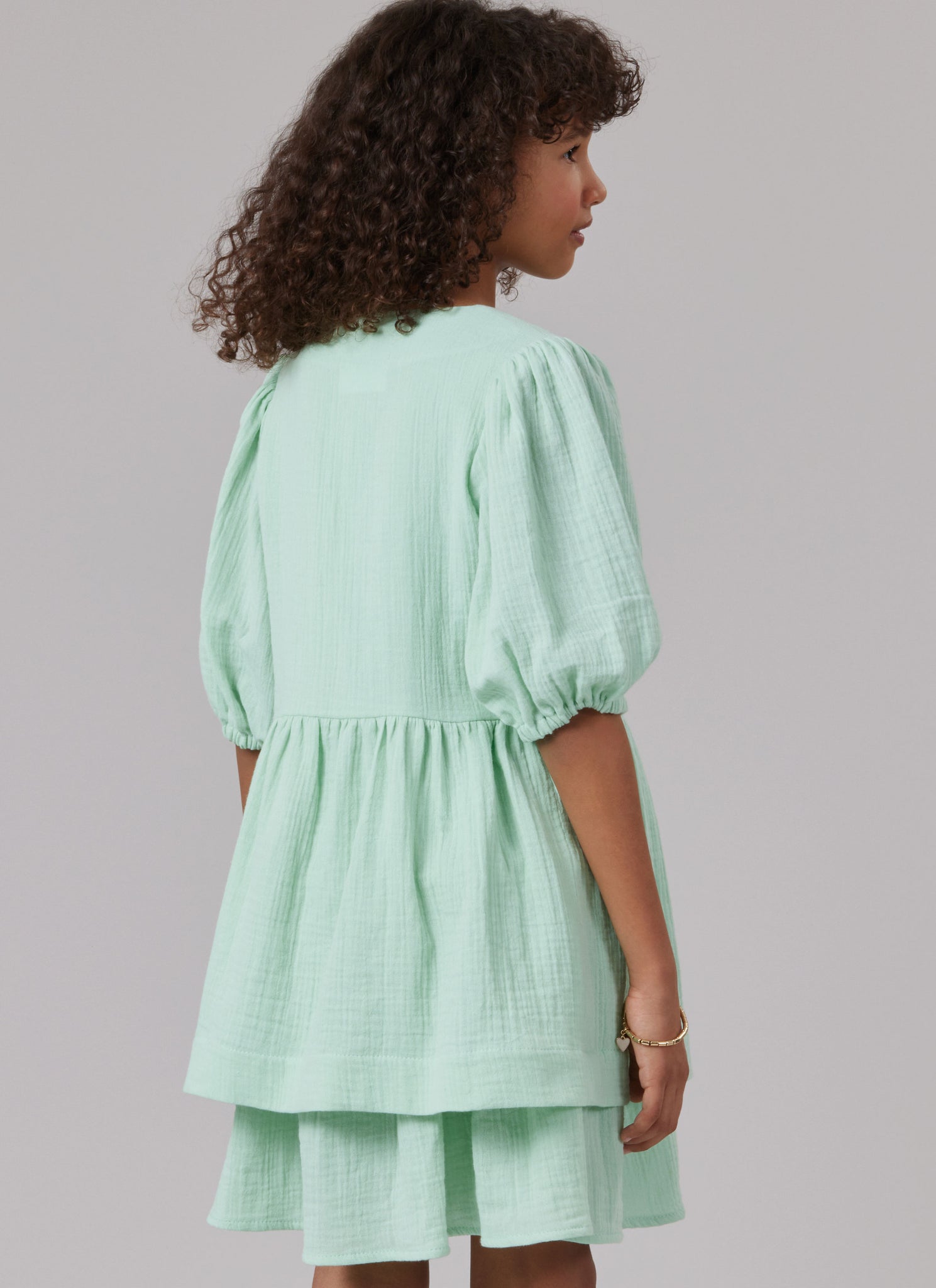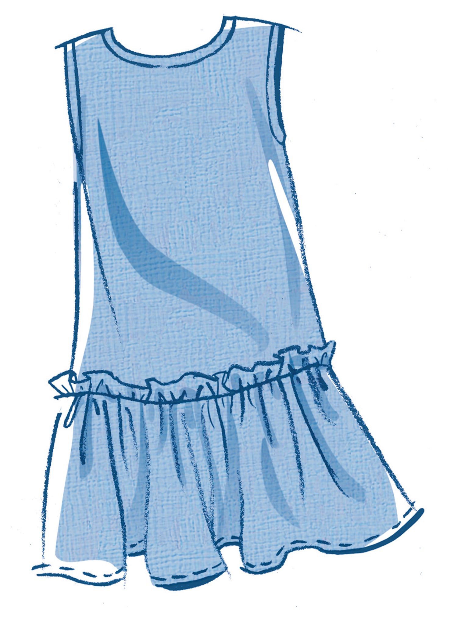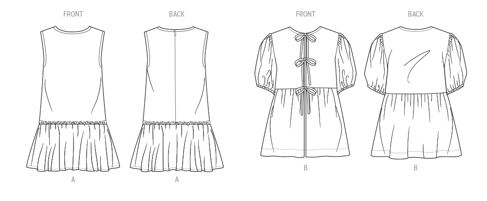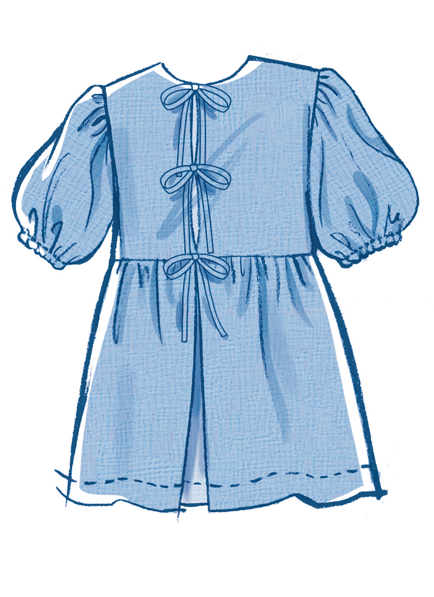 Create these adorable dress and top patterns for Girls sizes 7 to 14. Sleeveless dress has full gathered skirt, folded ruffles and invisible back zipper closure. Round neck top with front ties has gathers at waist and sleeves.