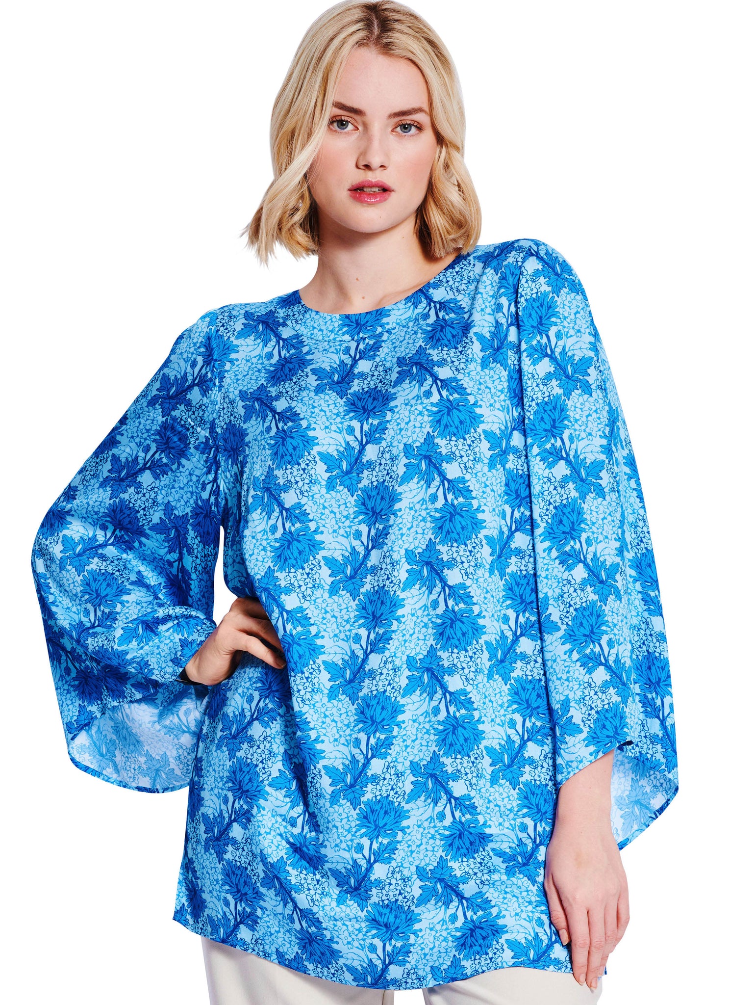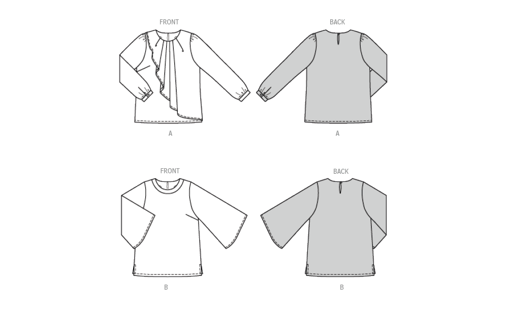 This pattern offers two versatile blouse and shirt options, perfect for experienced seamstresses. The tunic features a neckline facing and 70s-style bell sleeves, ideal for both cozy days at home and chic outfits with straight trousers and pumps. The second version impresses with a dramatic ruffle at the neckline that elegantly drapes, finished off with elegant rhinestone buttons on the cuffs. Perfect for creating looks that standout!