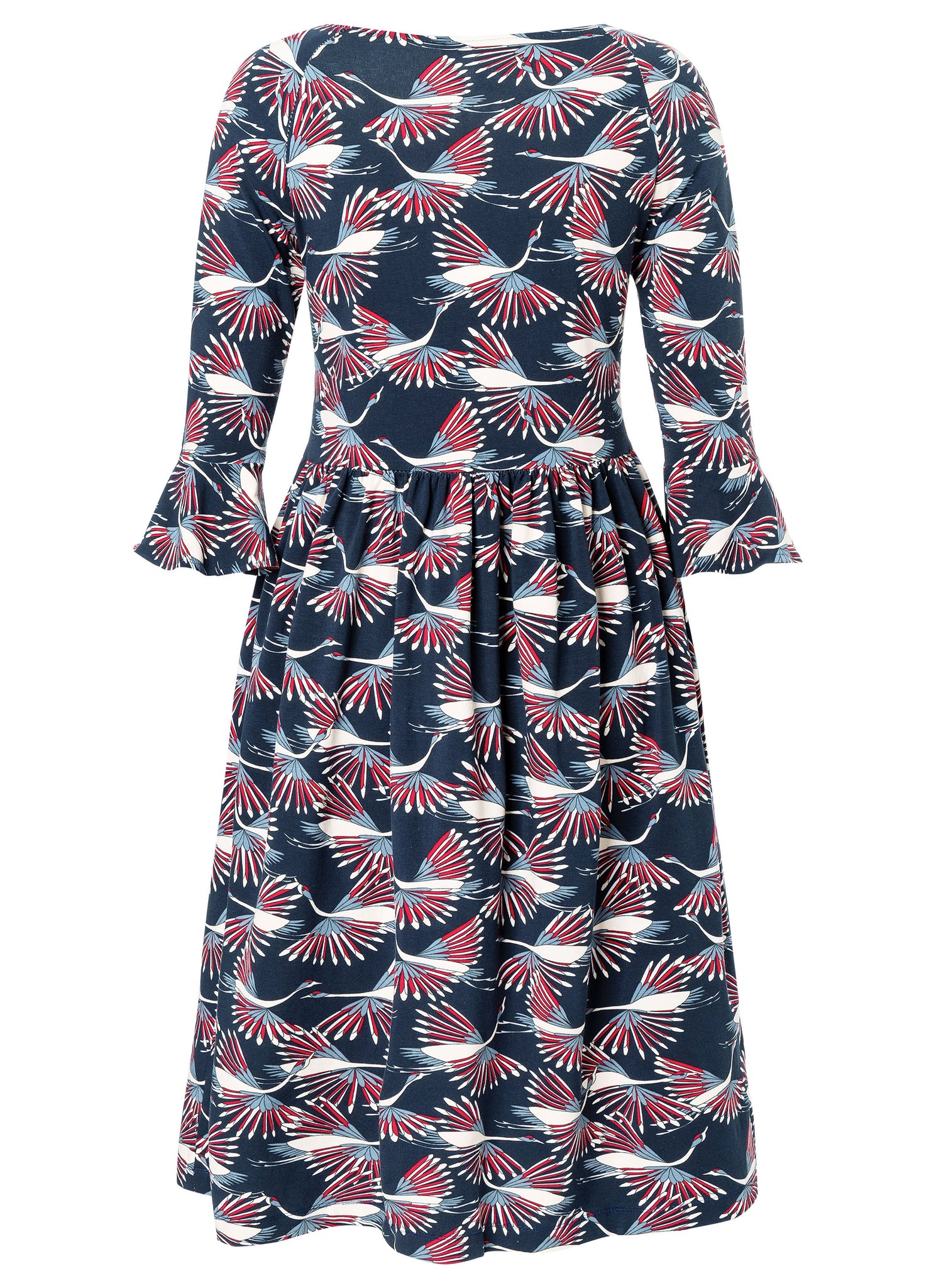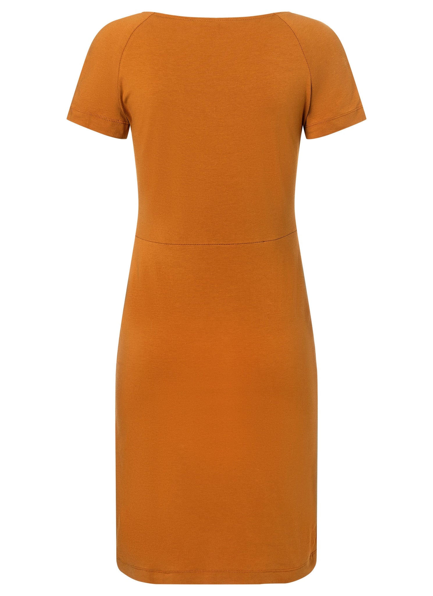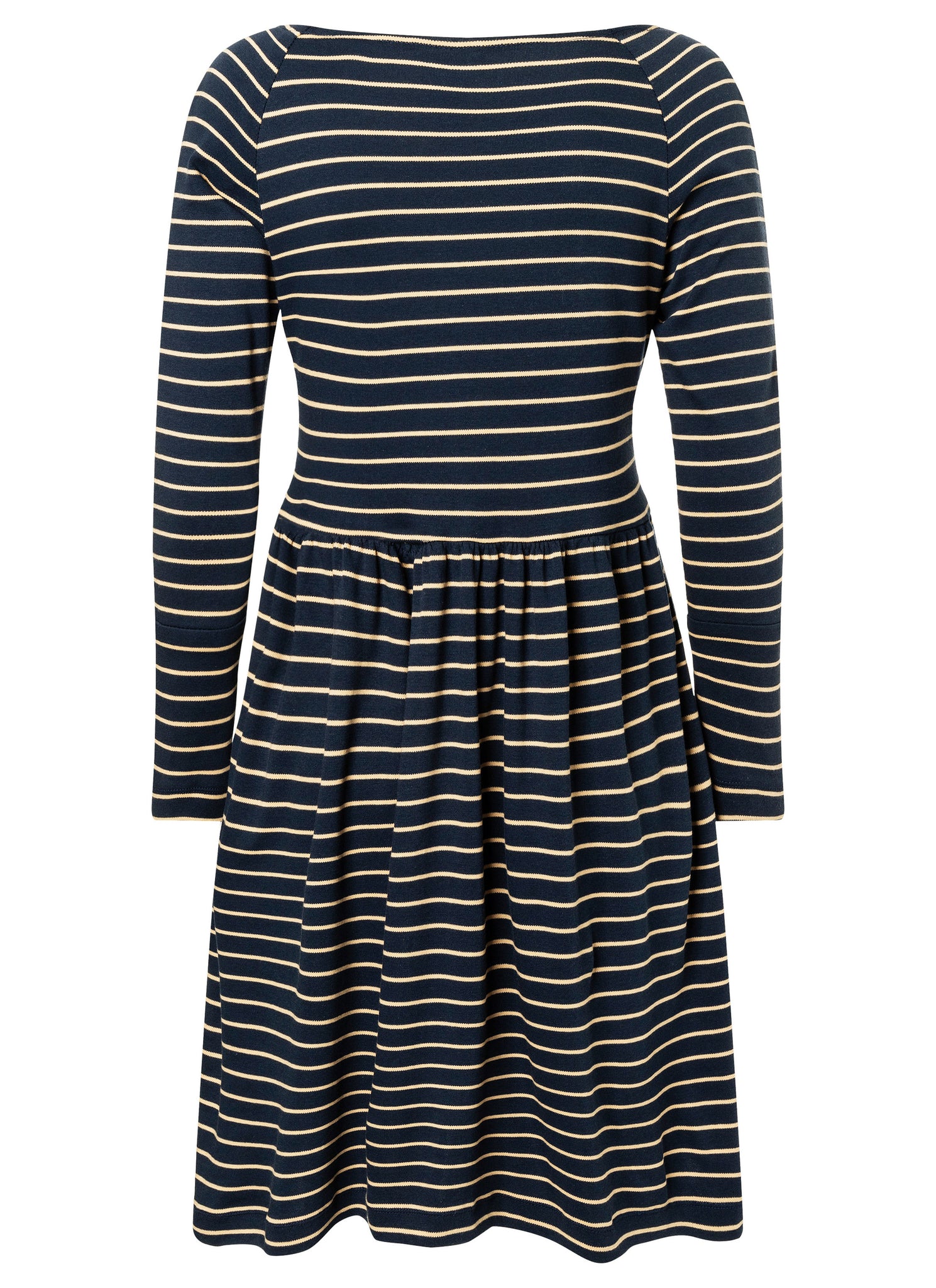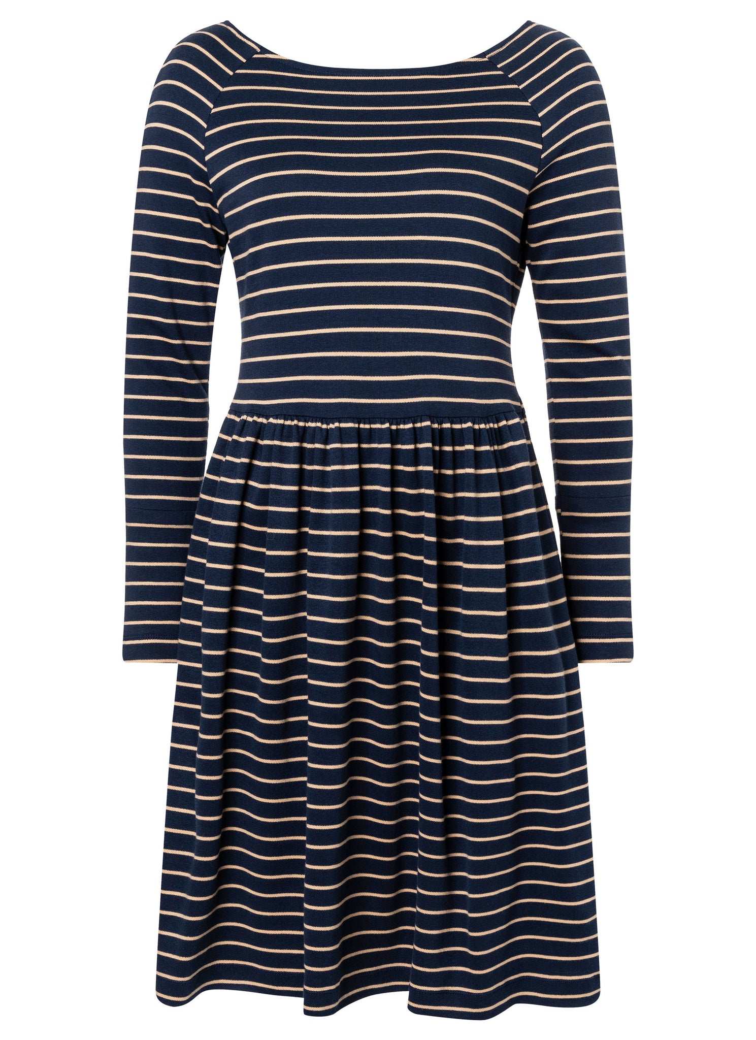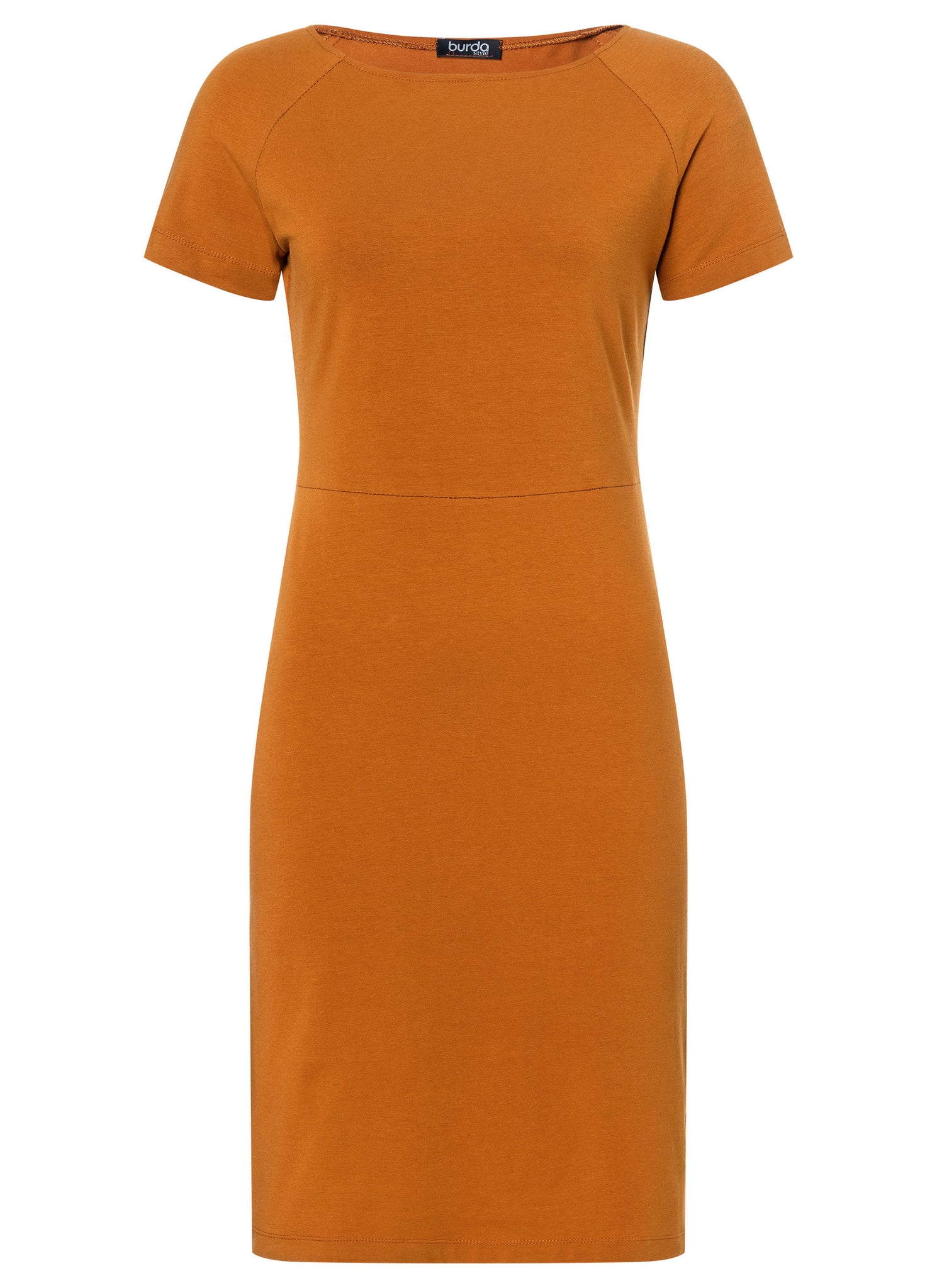 This dress comes in three easy sewing patterns! The striped jersey dress with a flared skirt and long sleeves is a must-have for any wardrobe. The slim shift dress in caramel is quick to sew and has an elegant look. The day dress offers a figure-hugging fit, feminine flounces and comfort thanks to organic jersey with elastane.