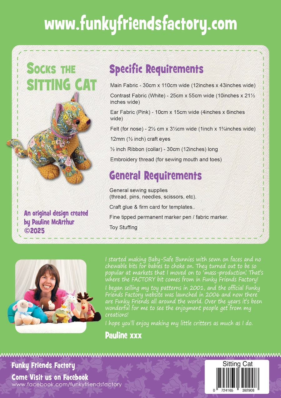 Designed with smooth curves and classic cat features, it sews up beautifully in prints, plains or soft furry fabrics.
