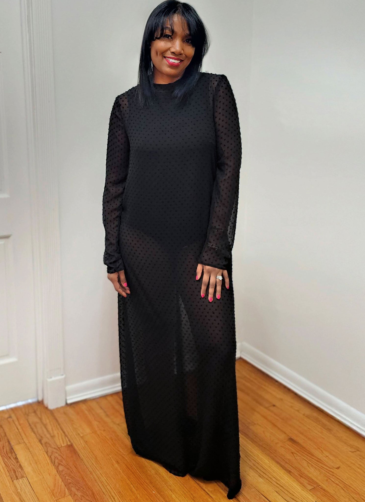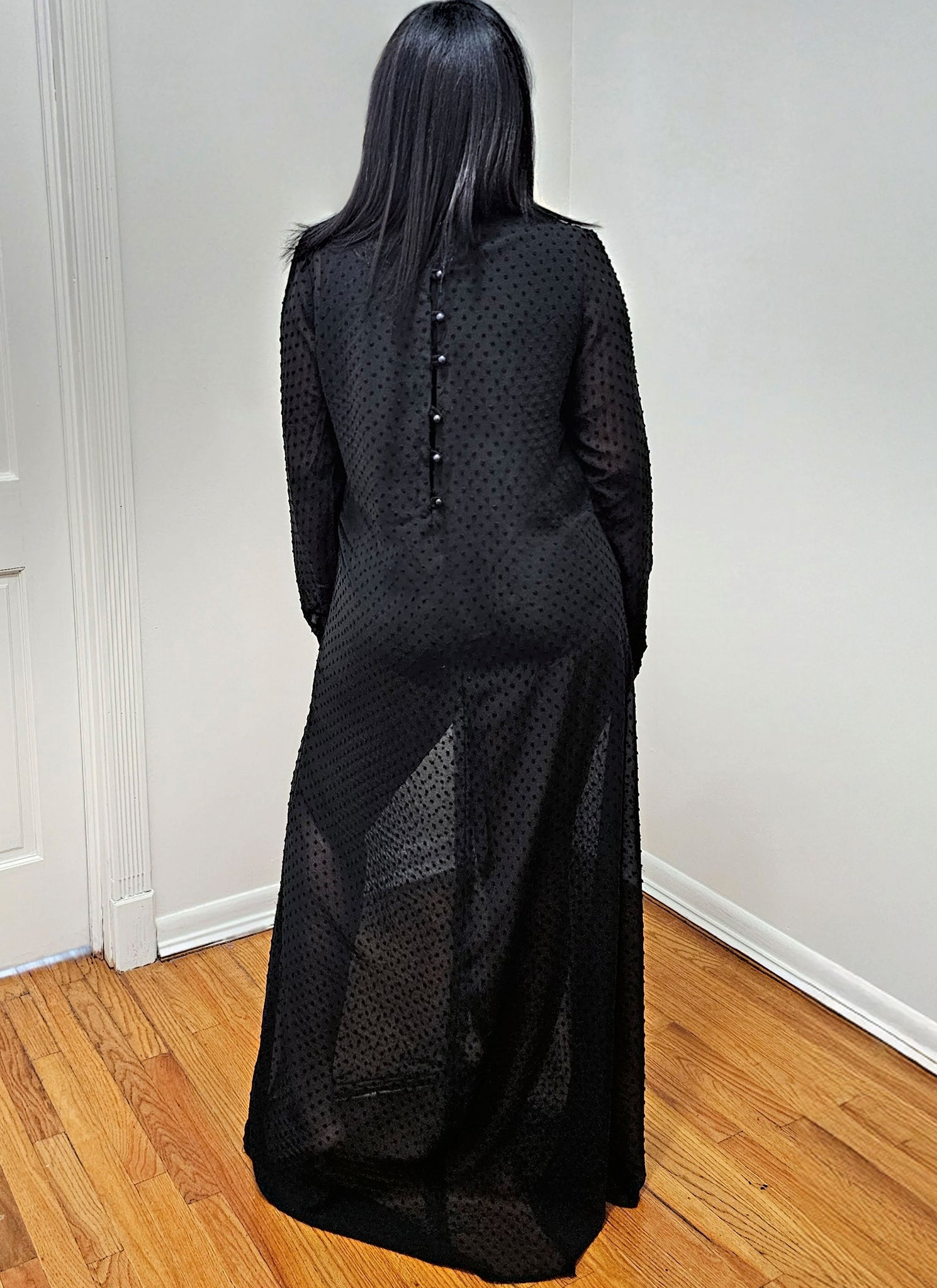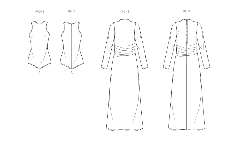 Racer back bodysuit with bust darts, elastic at legs and invisible zipper closure. Funnel neck dress has long sleeves, elastic rouching at the sides and buttons with elastic loops closure.