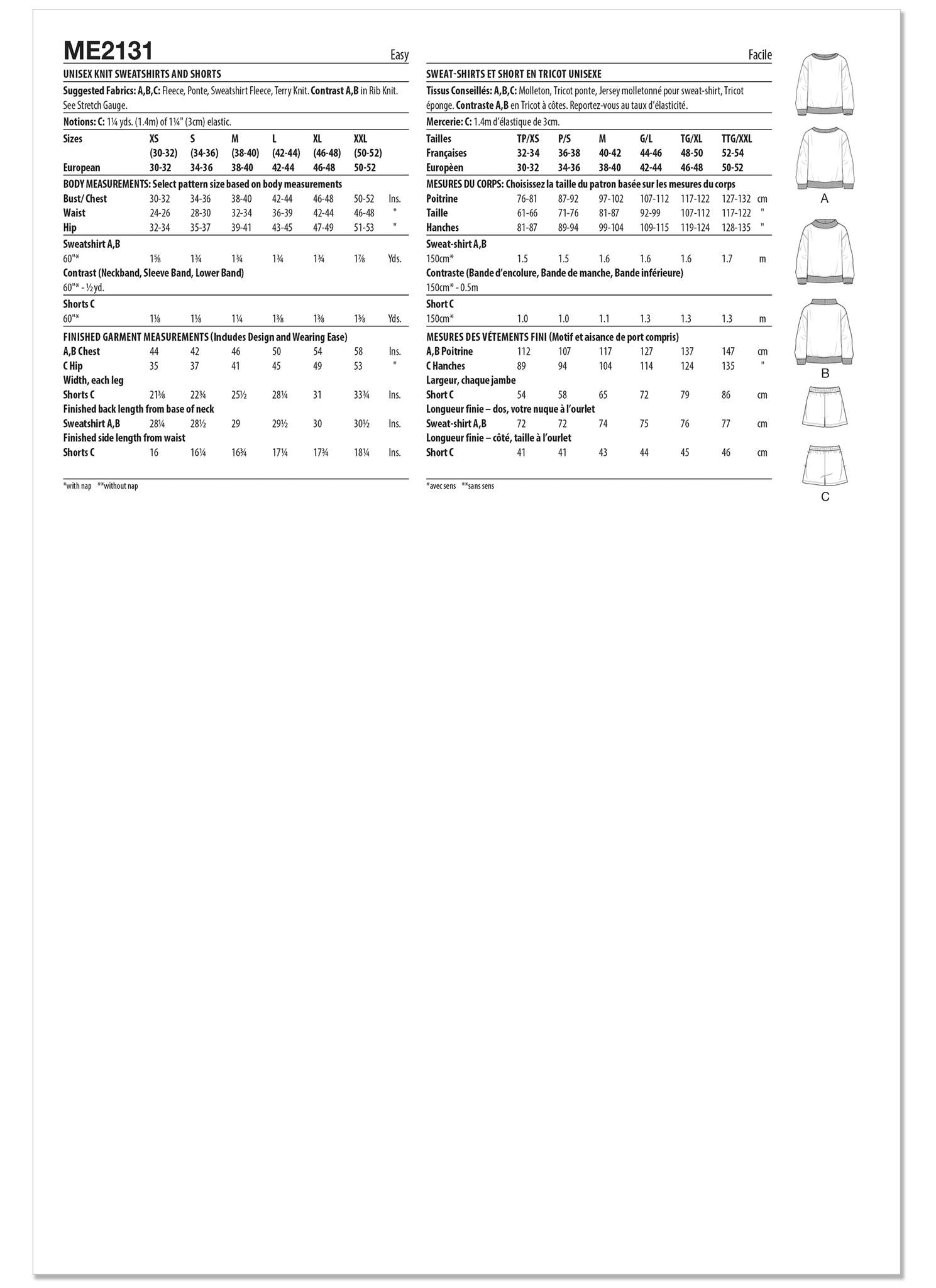 A,B,C: Fleece, Ponte, Sweatshirt Fleece, Terry Knit. Contrast A,B in Rib Knit. See Stretch Gauge.