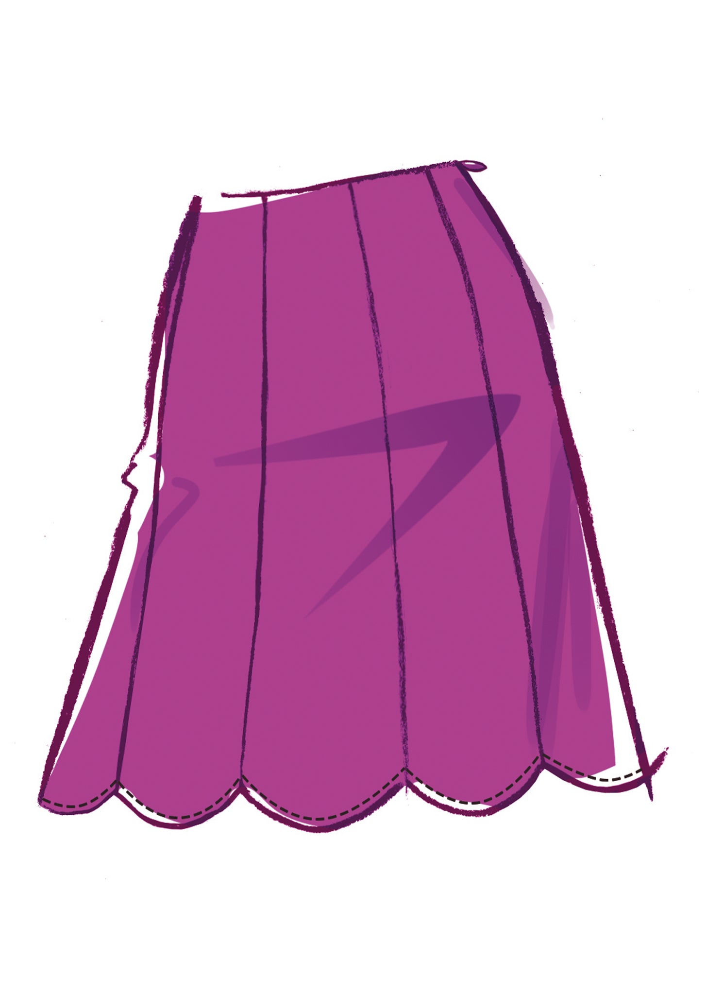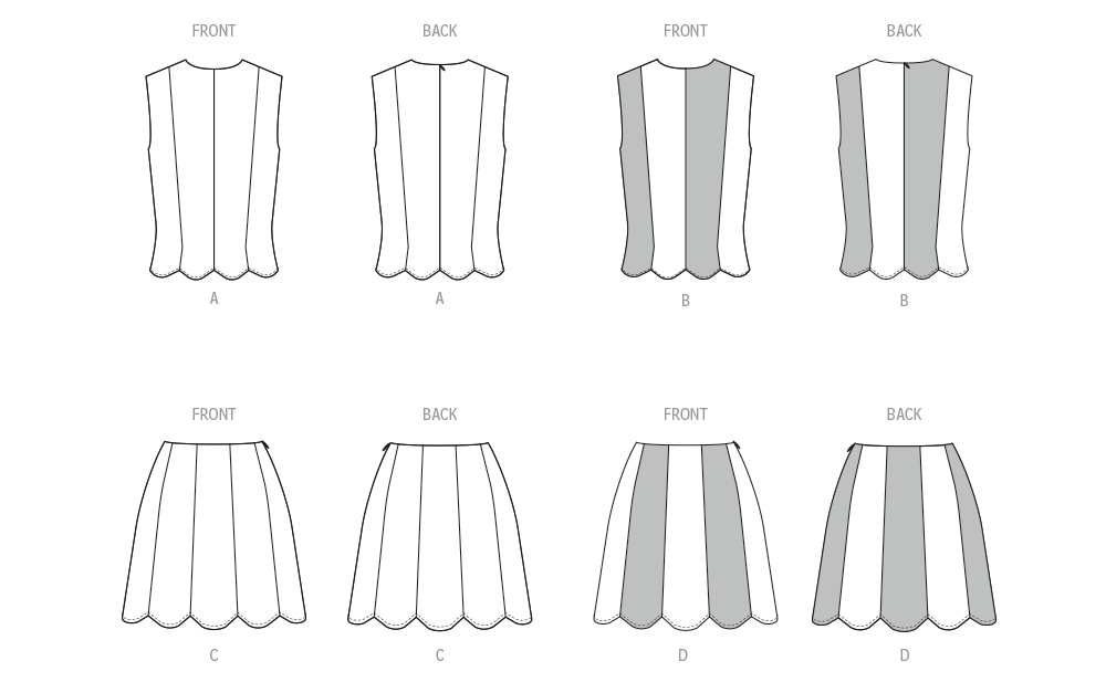 Sleeveless knit top and skirt have scalloped hem and invisible zipper closure.