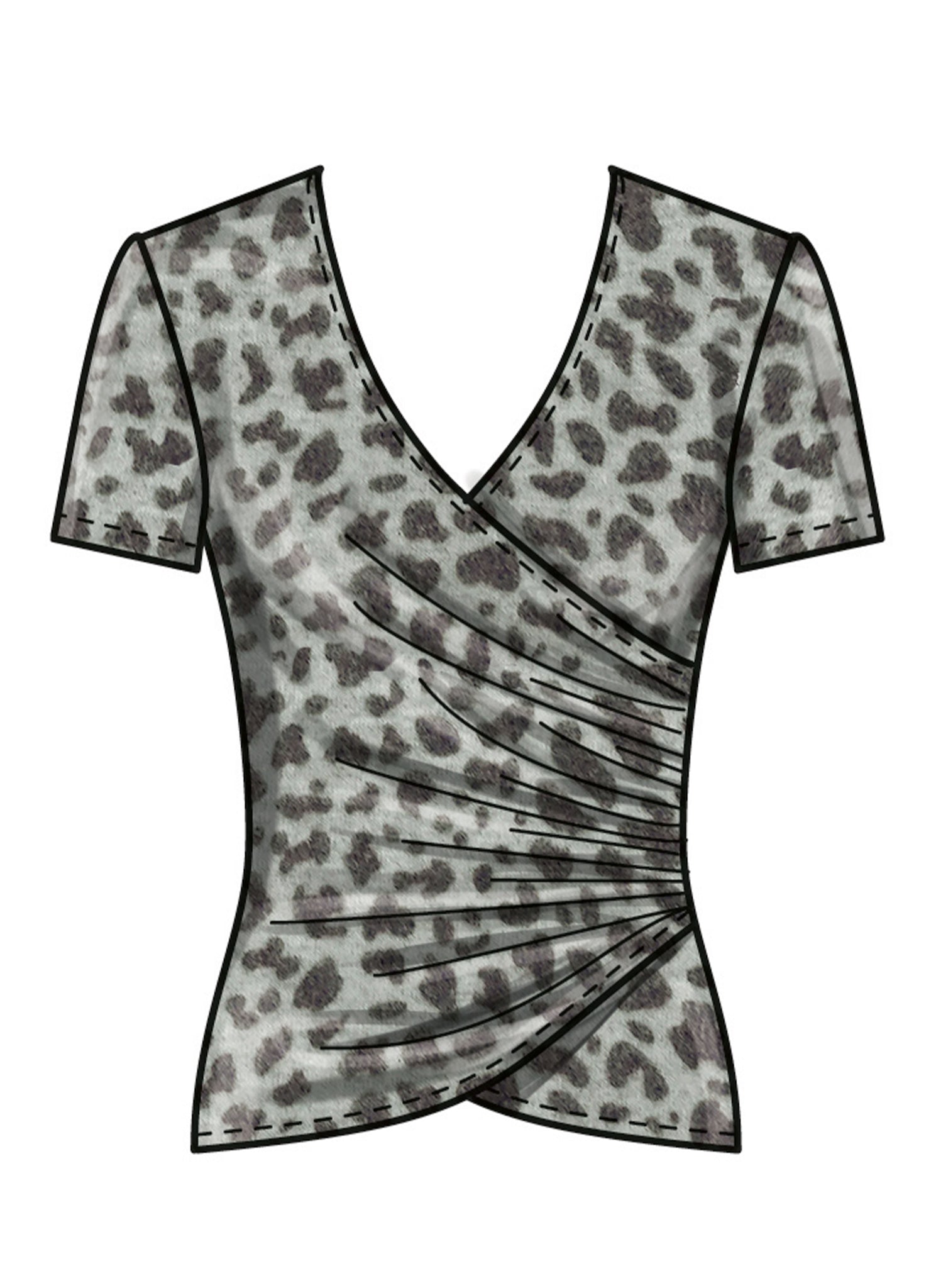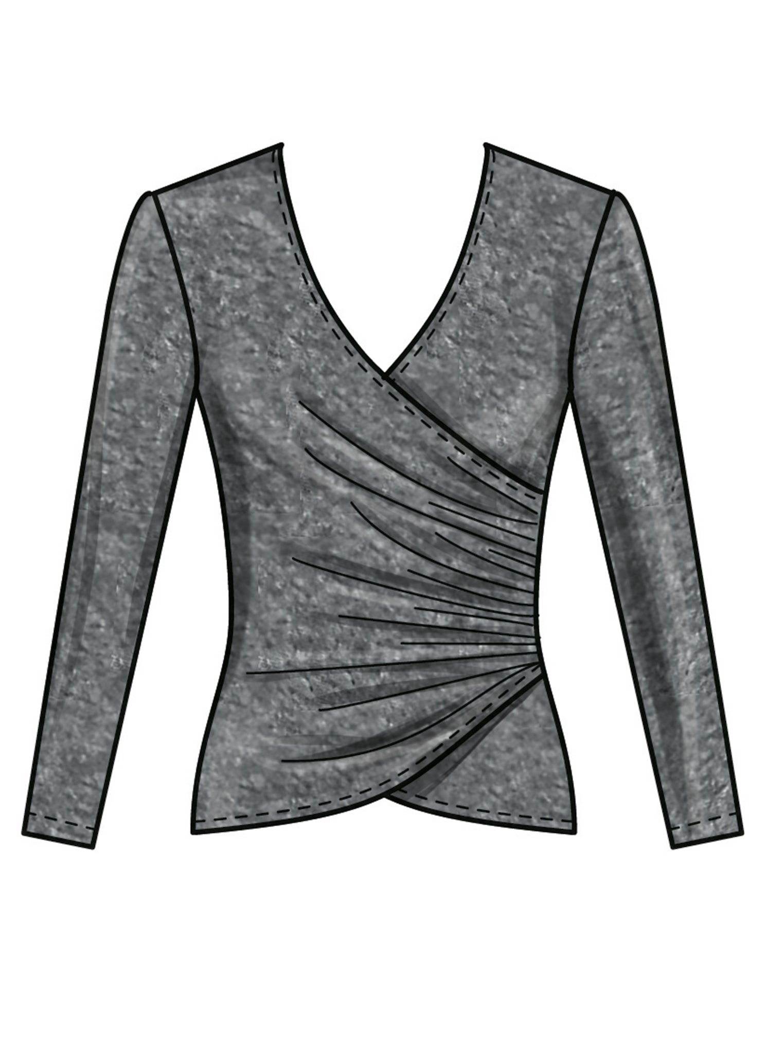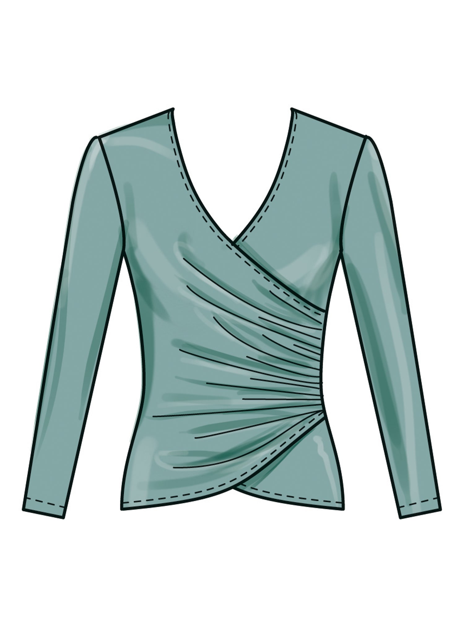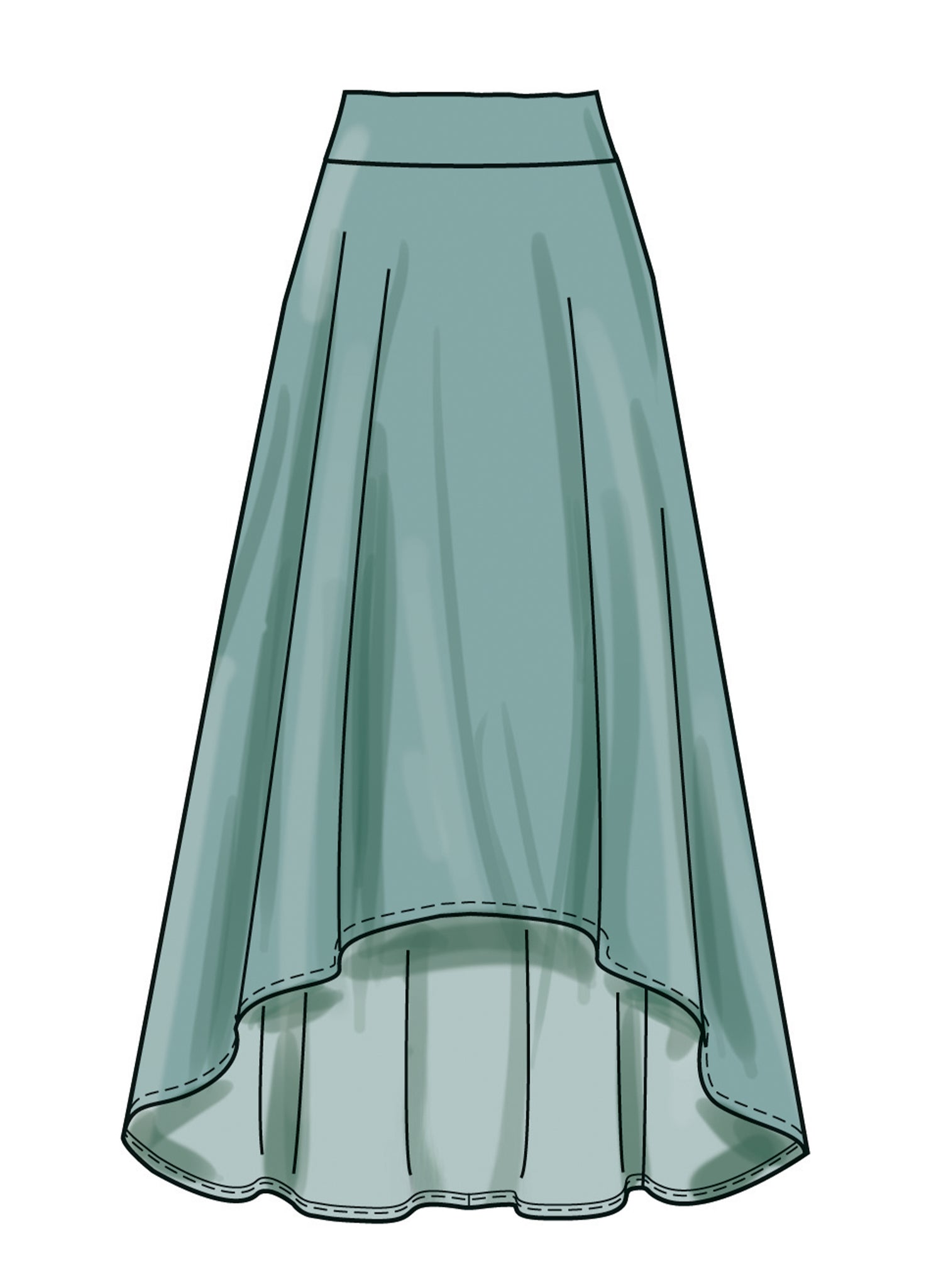 Close-fitting, pullover tops have wrap front with left side gathers, sleeve variations and narrow hems. Skirts (below waist) have elasticized waist, self-lined yoke variations and narrow hem. View D has high-low hem, wrong side shows. View E has gathered yoke.