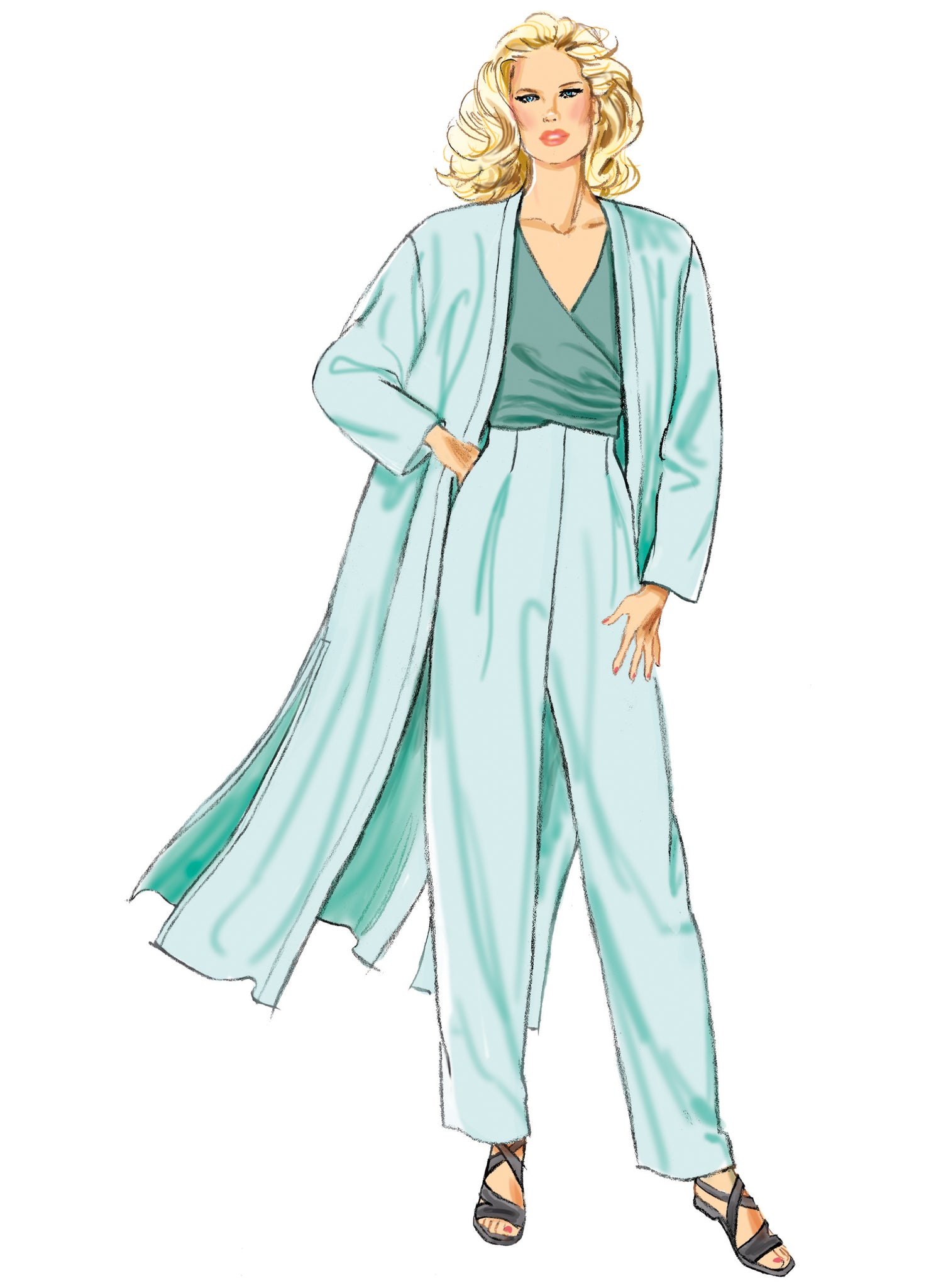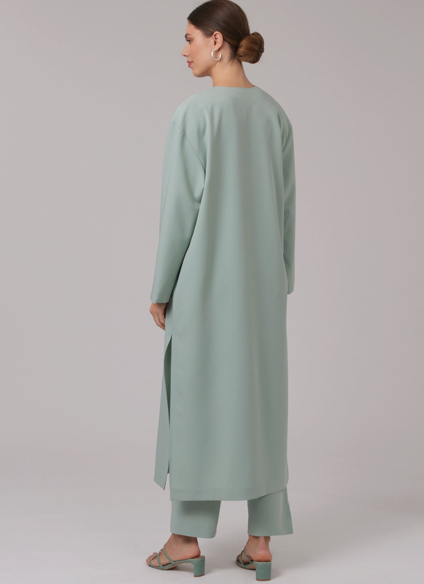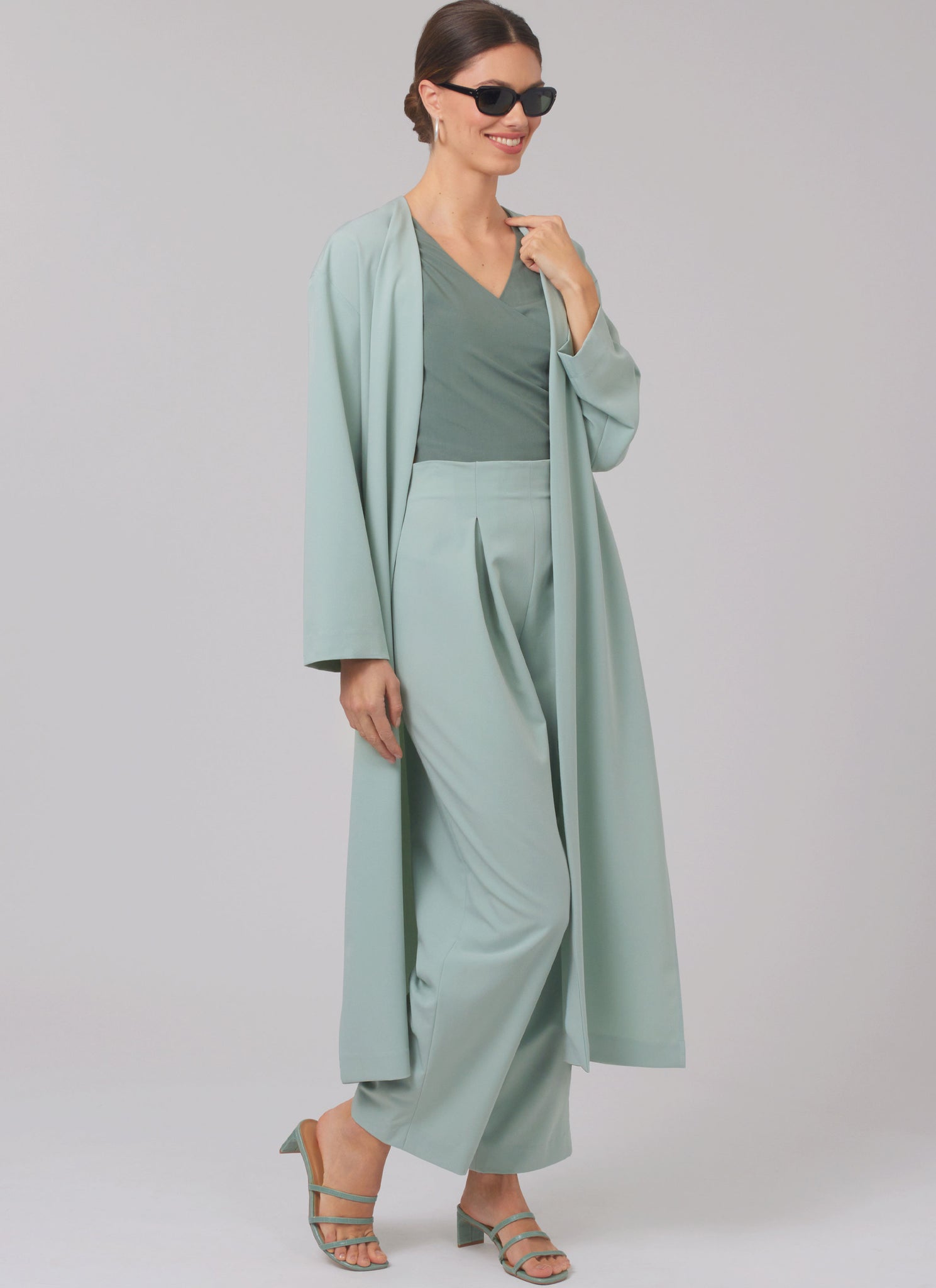Loose-fitting pull-on coat has full length sleeves, side seam pockets and deep side slits. Sleeveless tops with V-neckline have shaped attached ties. Top wraps and fastens of the back. Top fastens at the front. High-waisted trousers have front inverted pleats, back darts and left side zip closure.