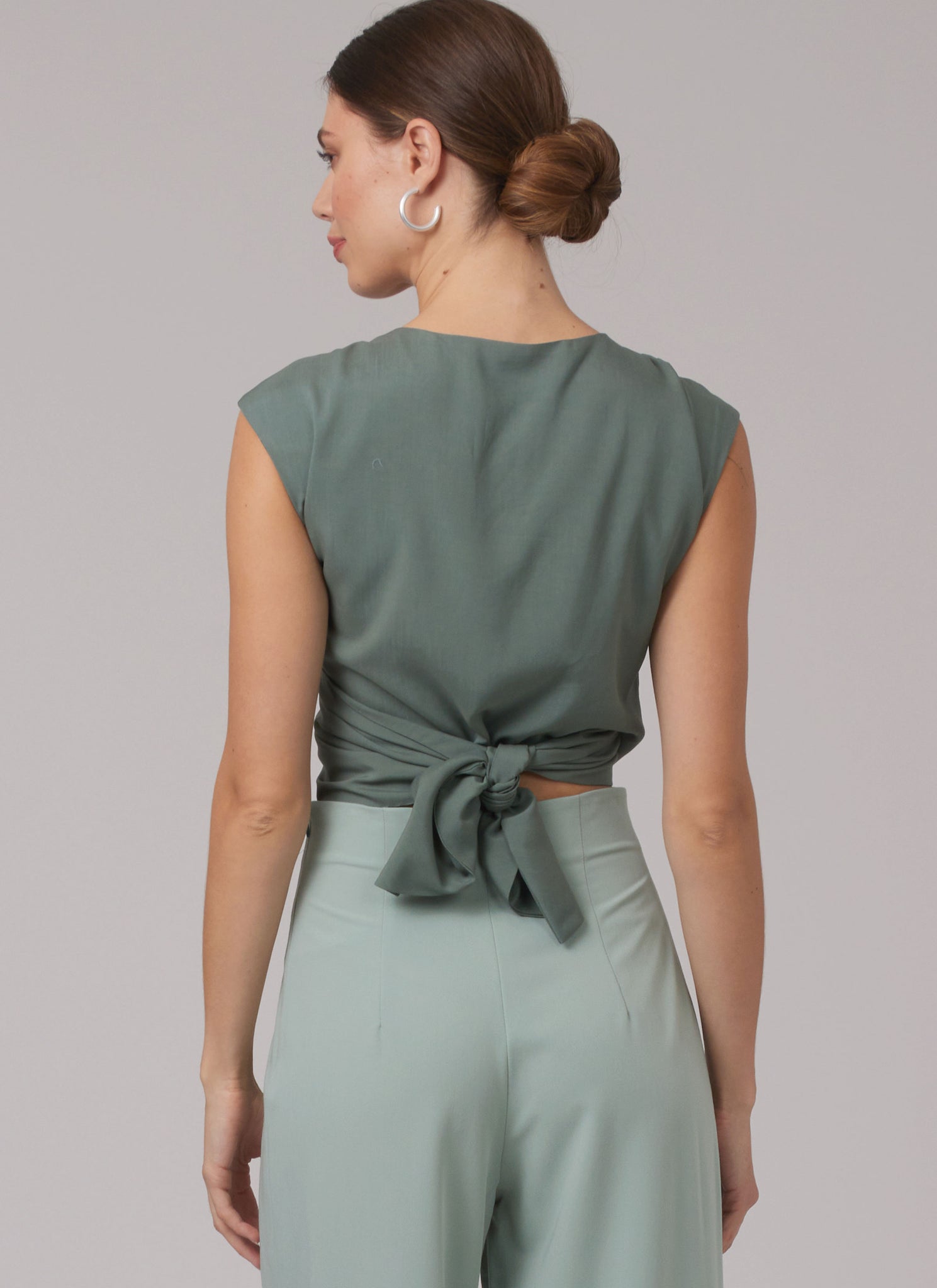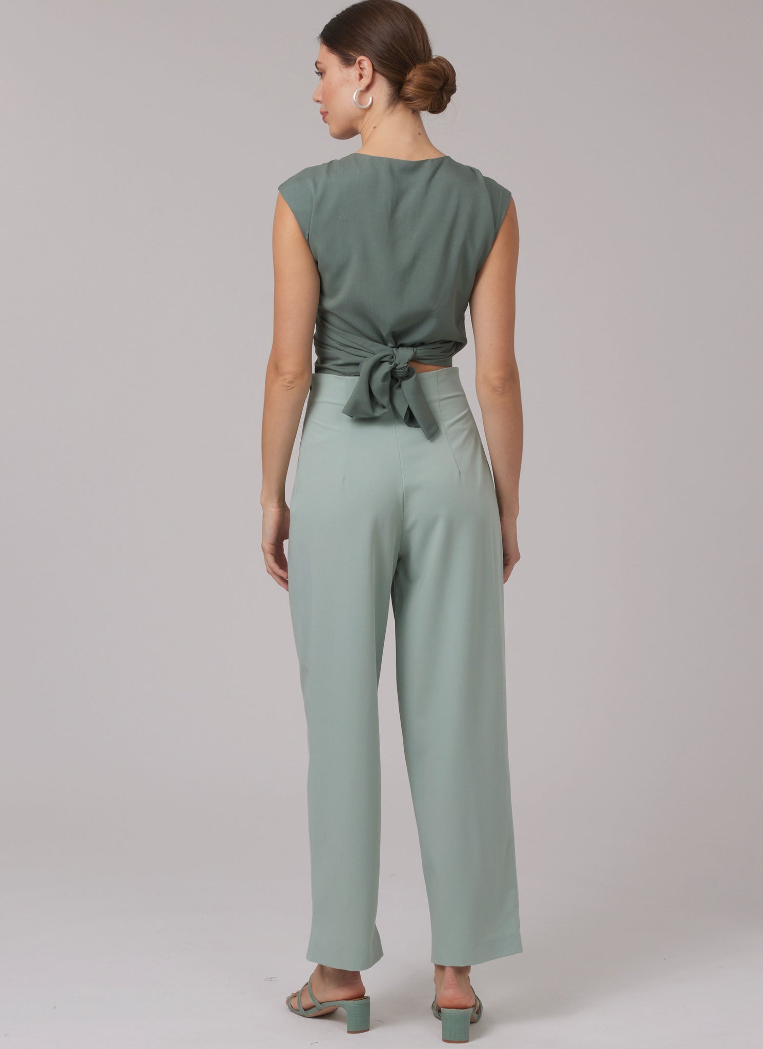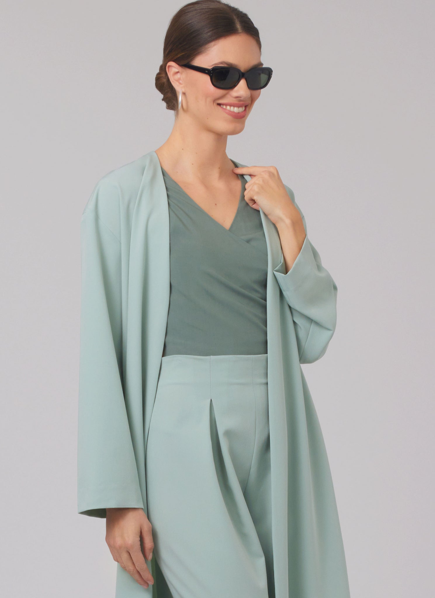 Loose-fitting pull-on coat has full length sleeves, side seam pockets and deep side slits. Sleeveless tops with V-neckline have shaped attached ties. Top wraps and fastens of the back. Top fastens at the front. High-waisted trousers have front inverted pleats, back darts and left side zip closure.