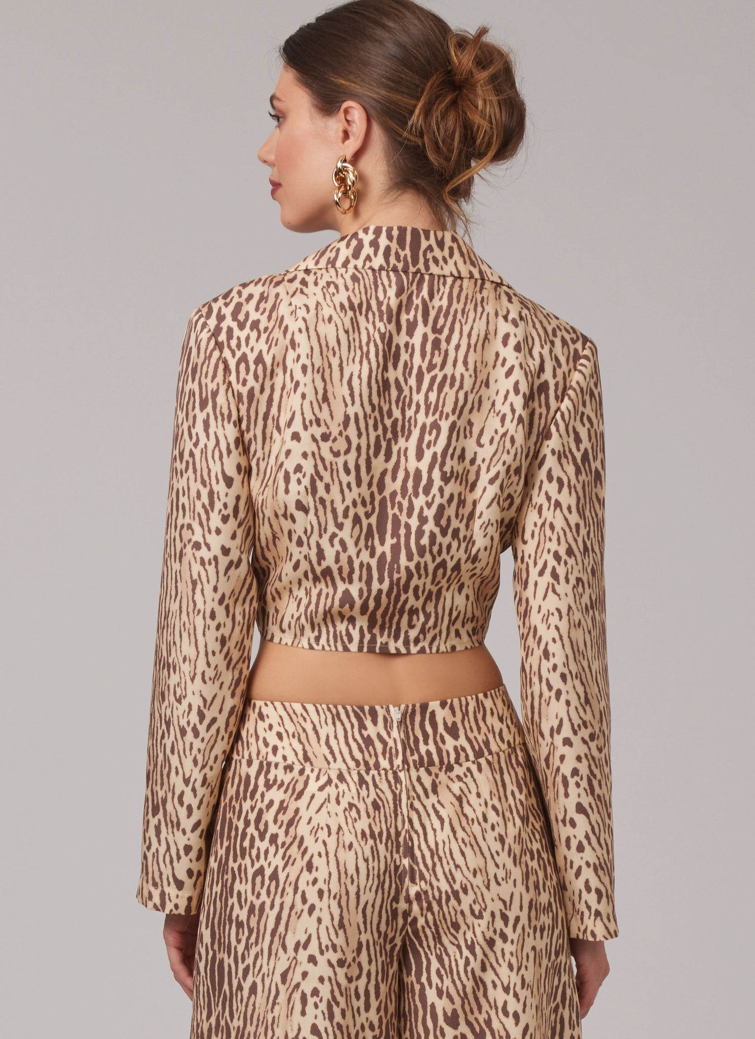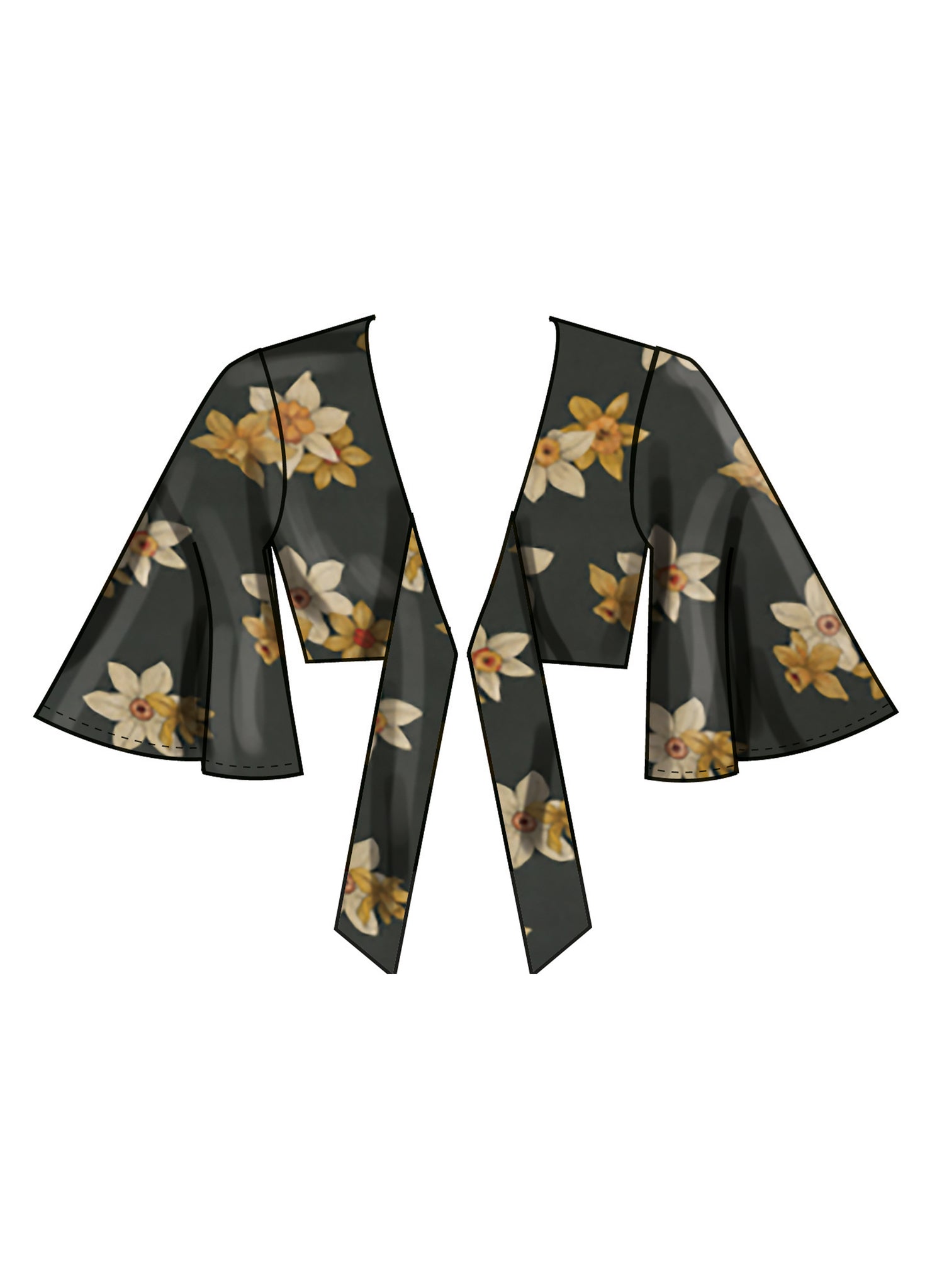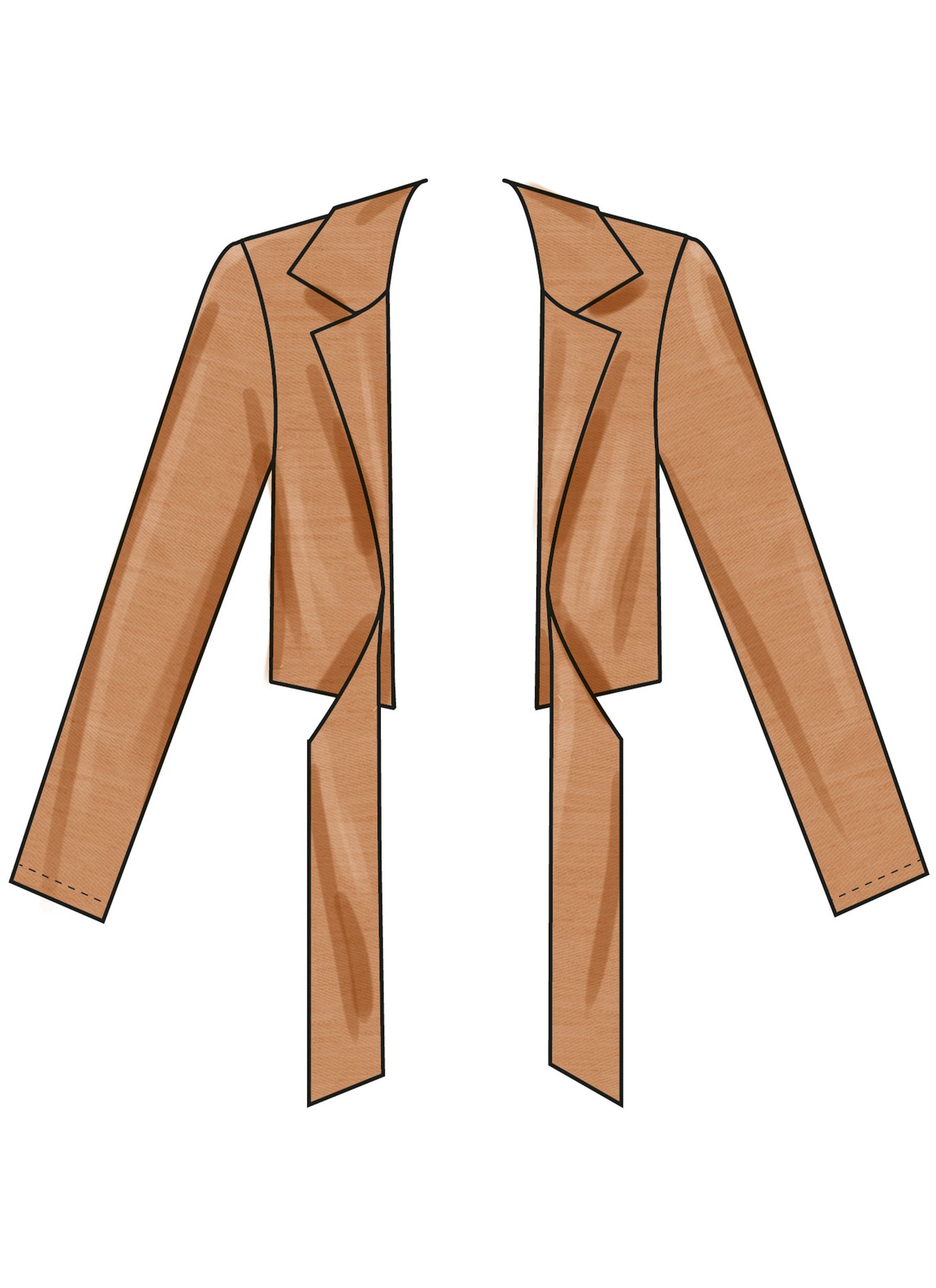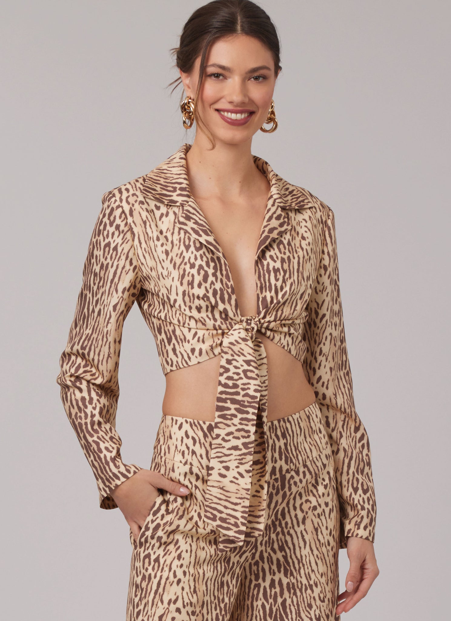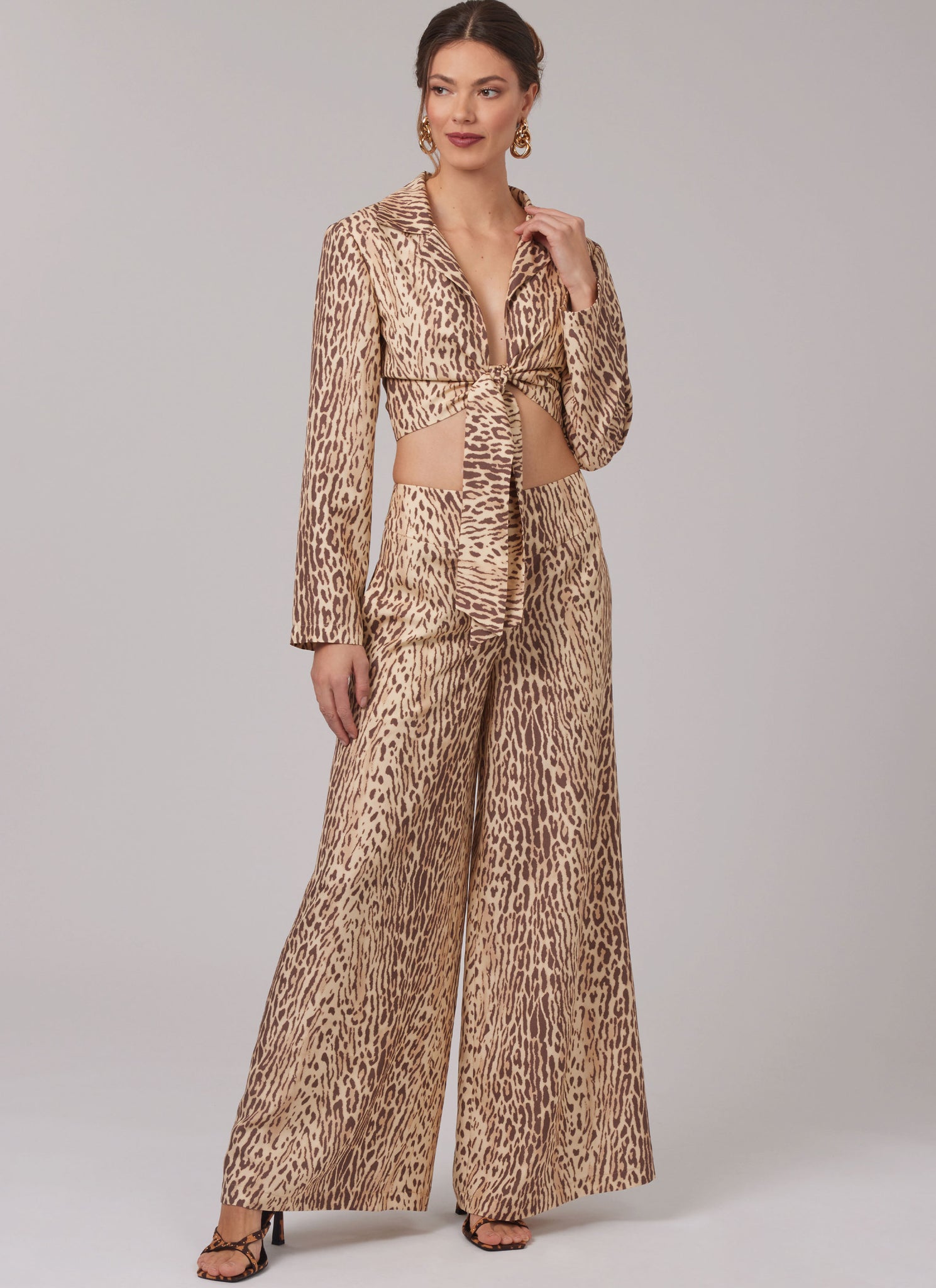 Close-fitting tie front tops have neckline, length and sleeve variations. Shorts and trousers are loose-fitting through the hip with wide front and back yokes, pockets and back zipper.