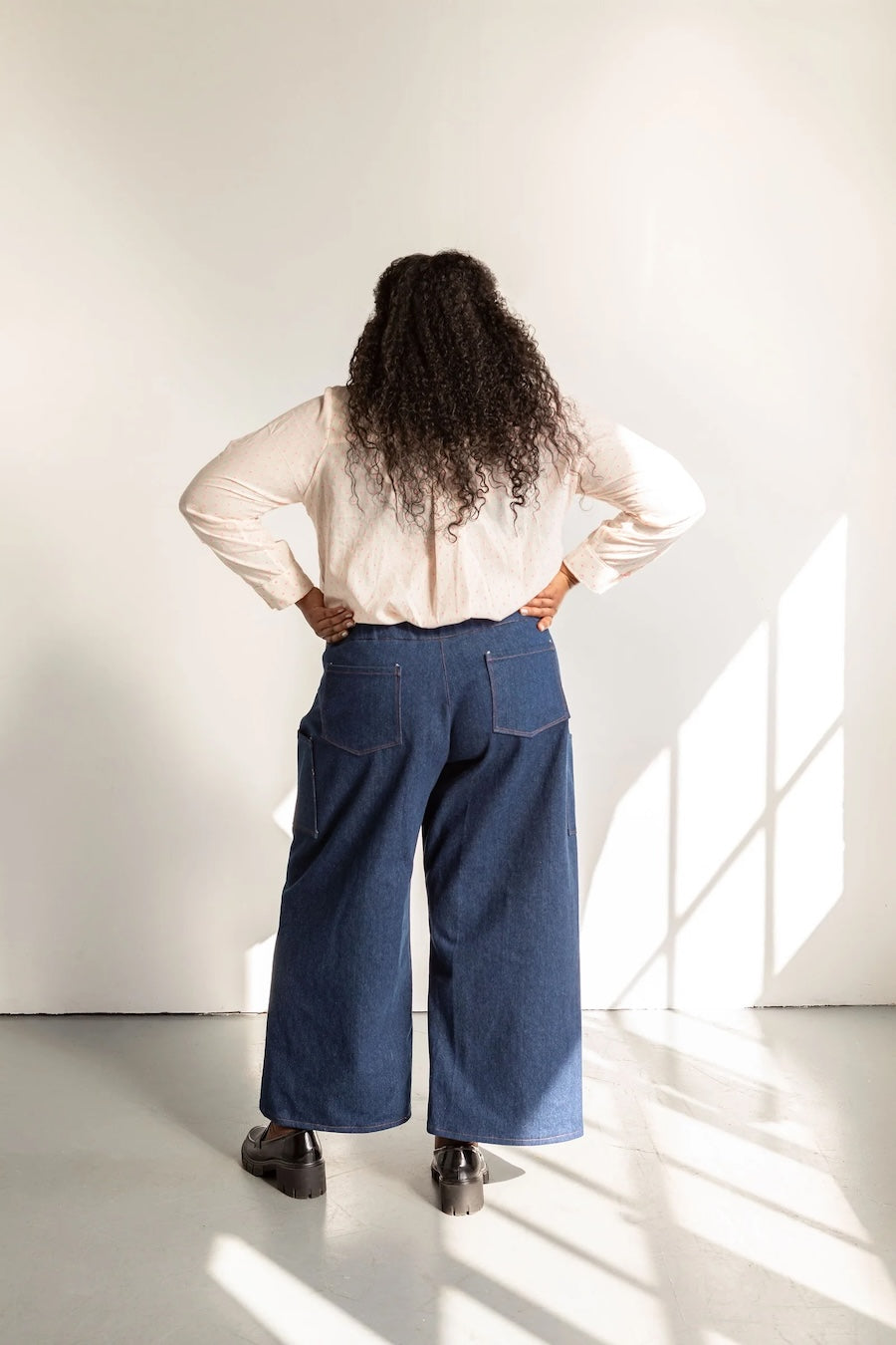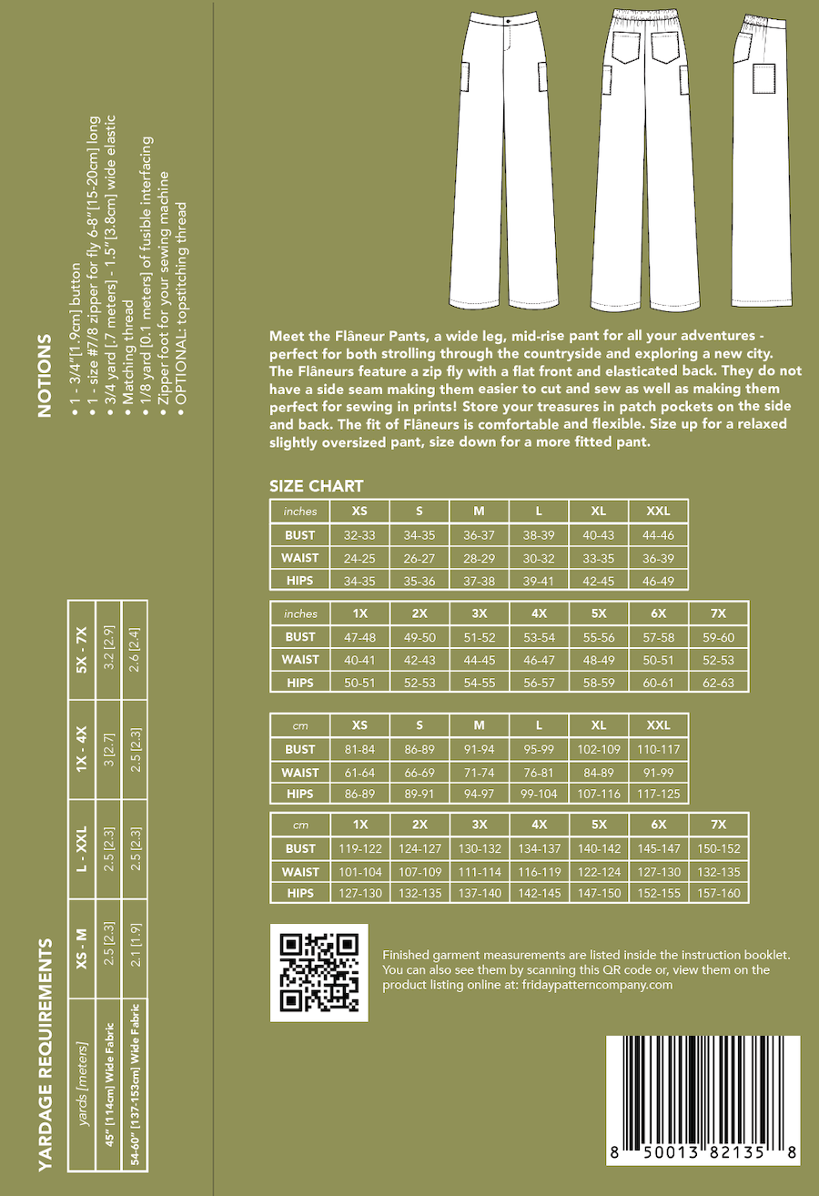 The Flâneur Pants are designed for mid- to heavy-weight woven fabrics. For a structured, workwear-inspired look, use cotton canvas, denim, or twill. For a lighter, flowier feel, opt for a 6–8 oz linen, suiting, or rayon twill.