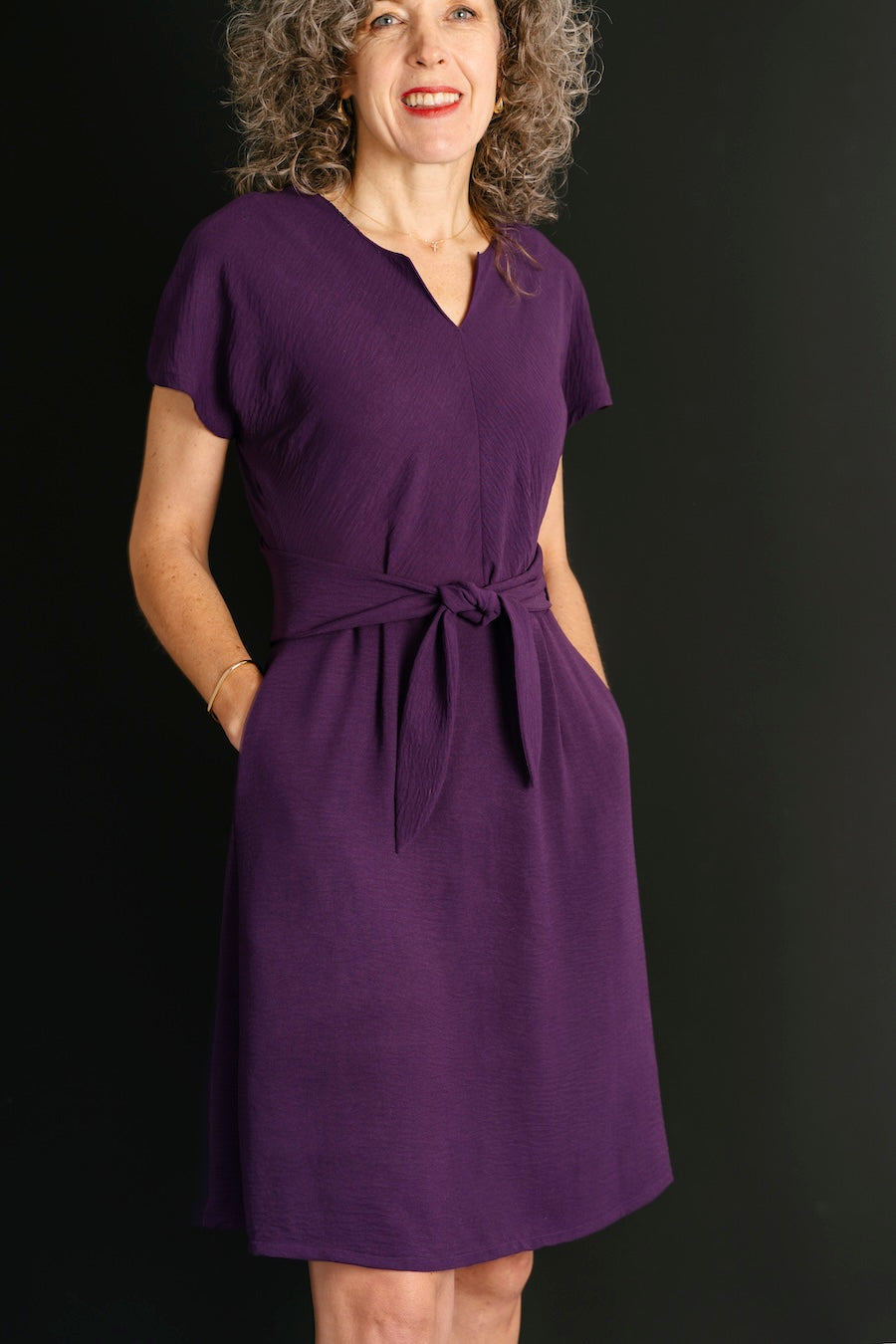 Both views feature ties at the front waist, on-seam pockets, a bias-cut top for beautiful drape (top can also be cut on grain, if desired), a notch at the front neck, and a V-neck at the back.