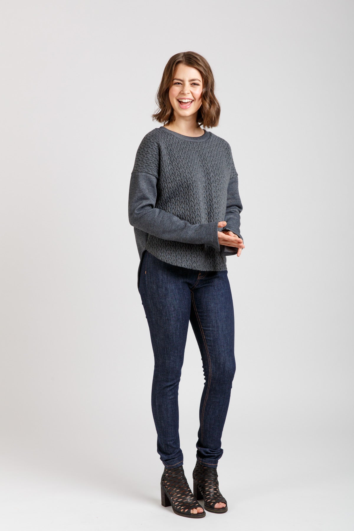 It's a wonderful pattern that Nic and I have made loads. A classic sweatshirt with dropped sleeves you'd think; but it has so many versions that take it into a really versatile top - from a cowl neck to band; different hems (including a tie front) plus the ability to make it more of a t-shirt depending on the fabric you choose. The options are endless in fact!